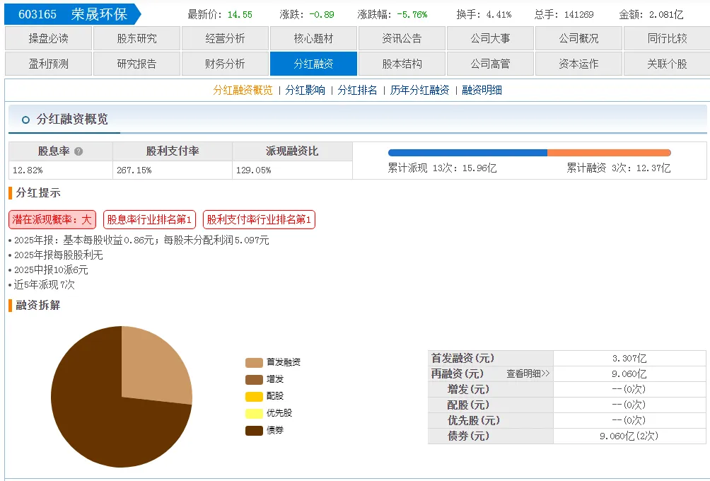 荣晟环保,股息率12.08%,排在第二。