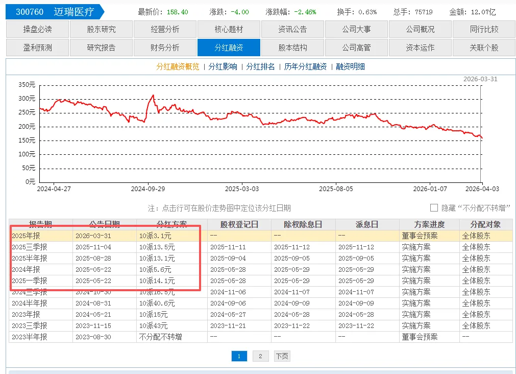 比如 迈瑞医疗,去年一口气分了4次红。