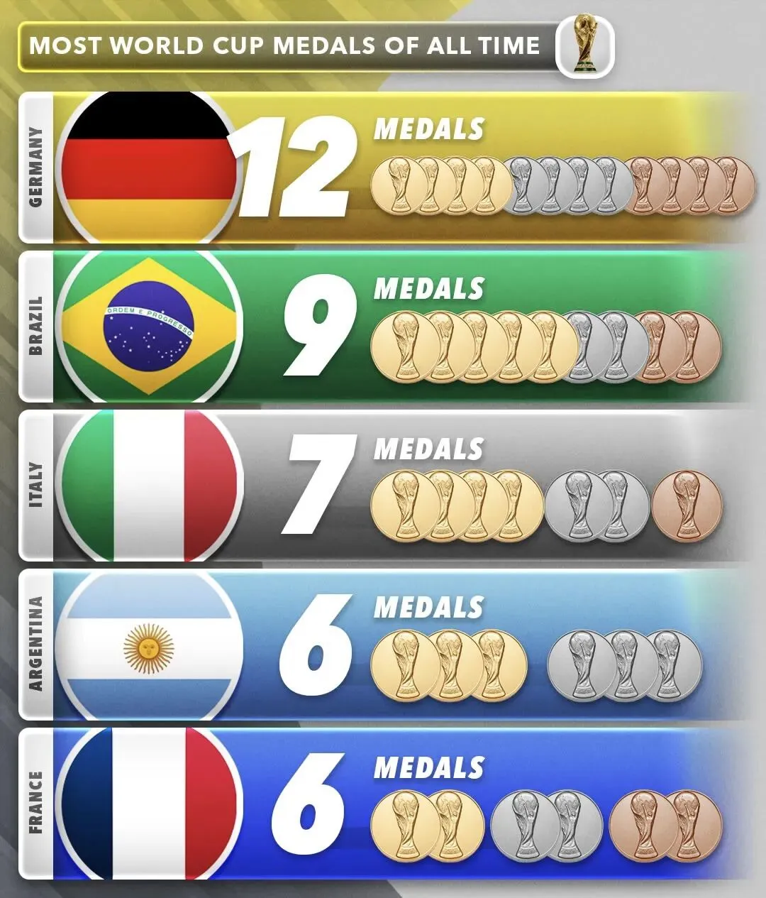 世界杯夺冠亚季军最多国家排行榜