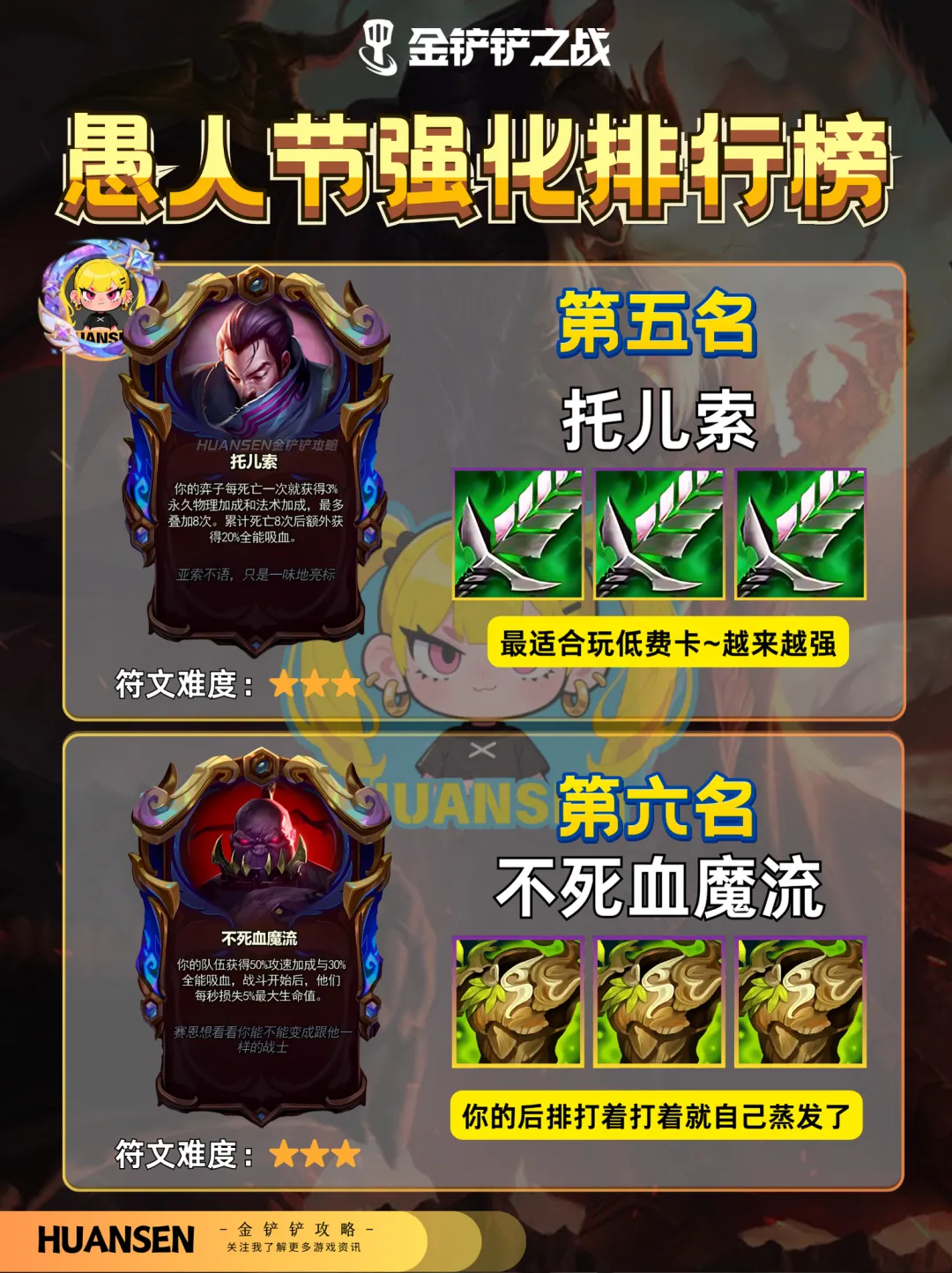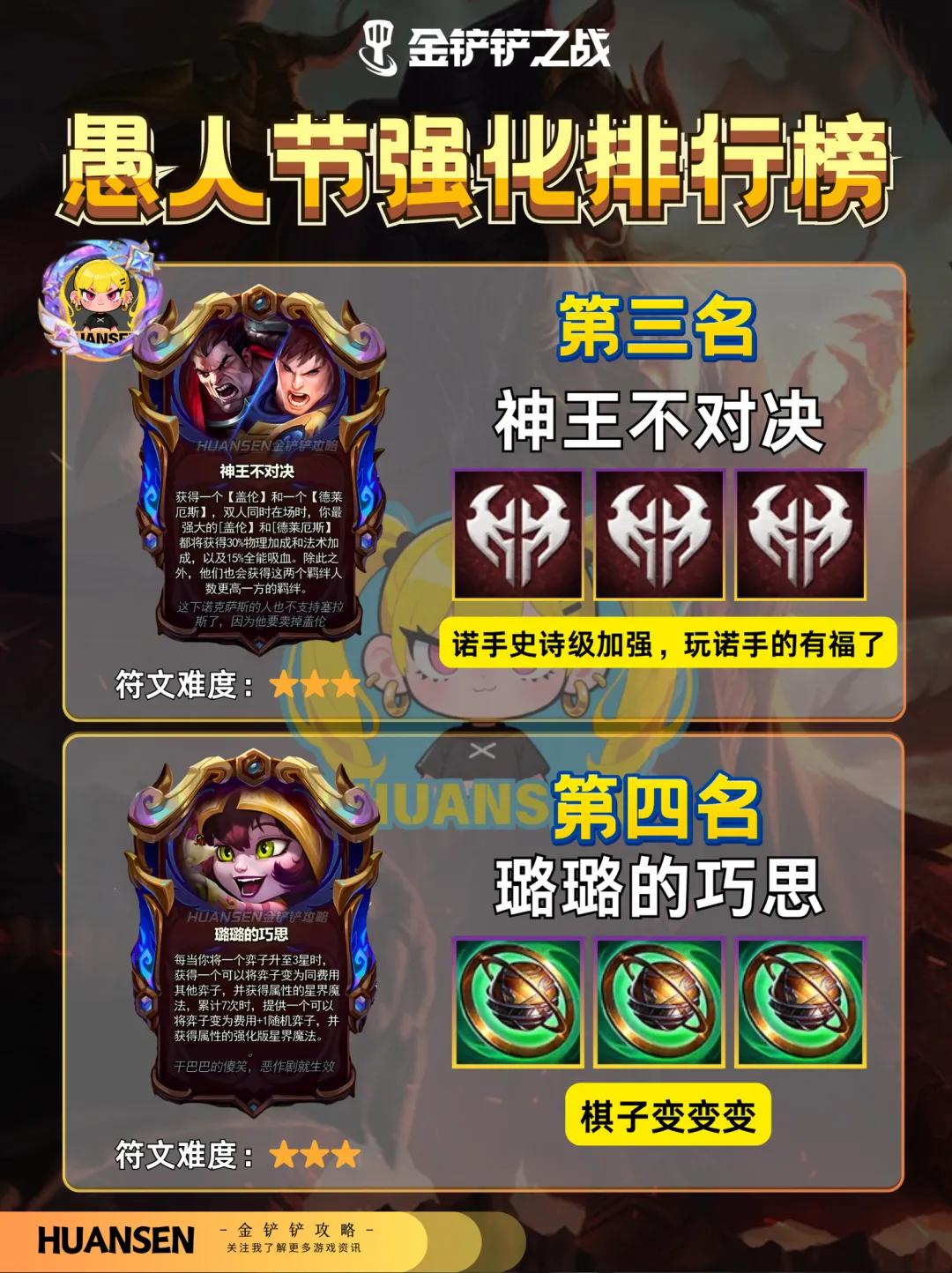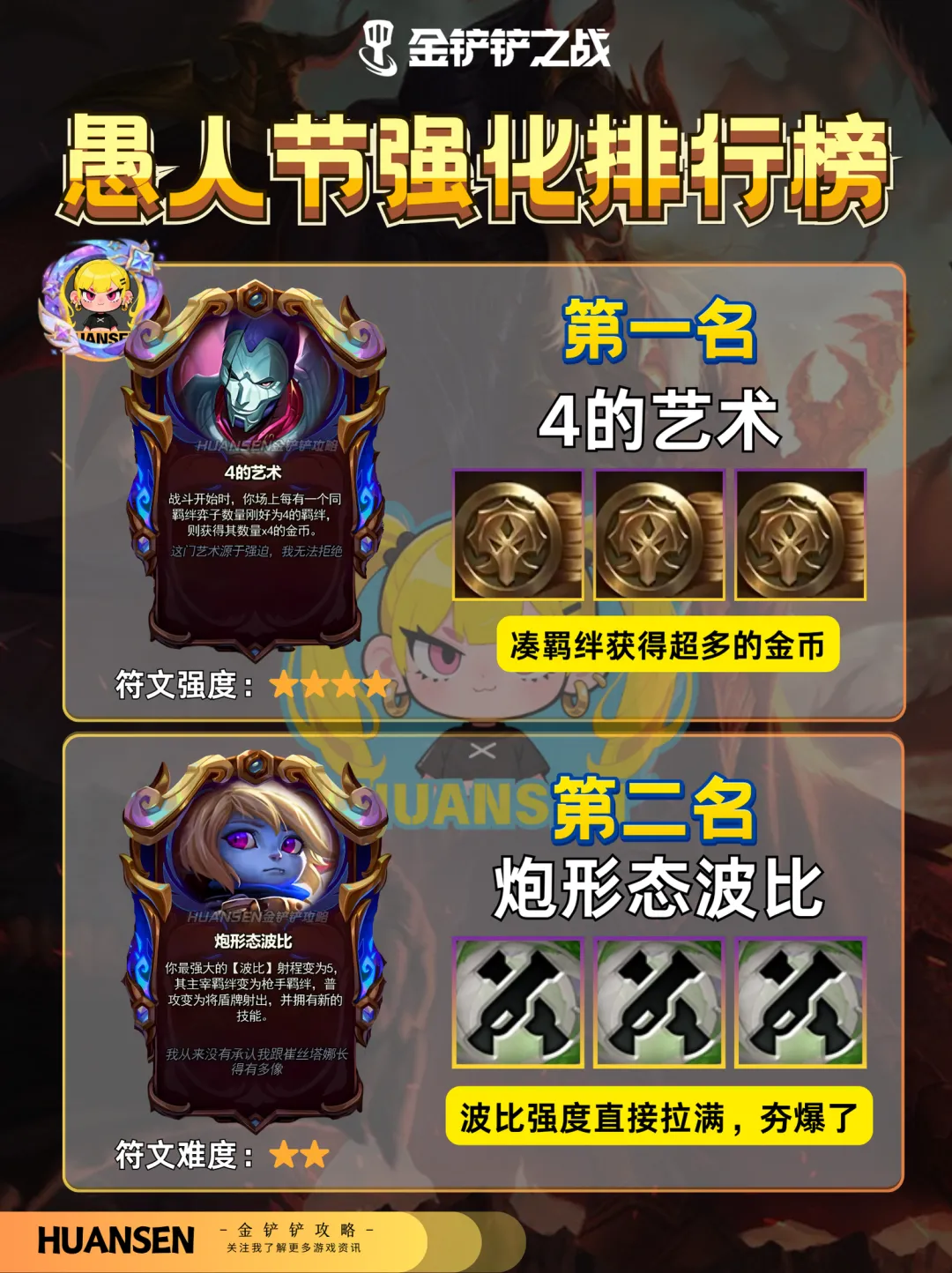 铲铲愚人节强化排行榜来啦~ 第一名:4 的艺术无脑拿经济爆炸 第二名:神王不对决,适合玩诺手的宝子 第三名:炮形态波比远程射爆后排,强度也很可以 第四名:璐璐的巧思,升 3 星可换同费棋子,变阵灵活,上限拉满 第五名:托儿索,棋子死亡叠属性,低费卡越战越强,越打越猛 第六名:血魔流容易直接让自己后排蒸发 第七名:金克丝强化效果随机不稳定,纯坑货,谁拿谁后悔