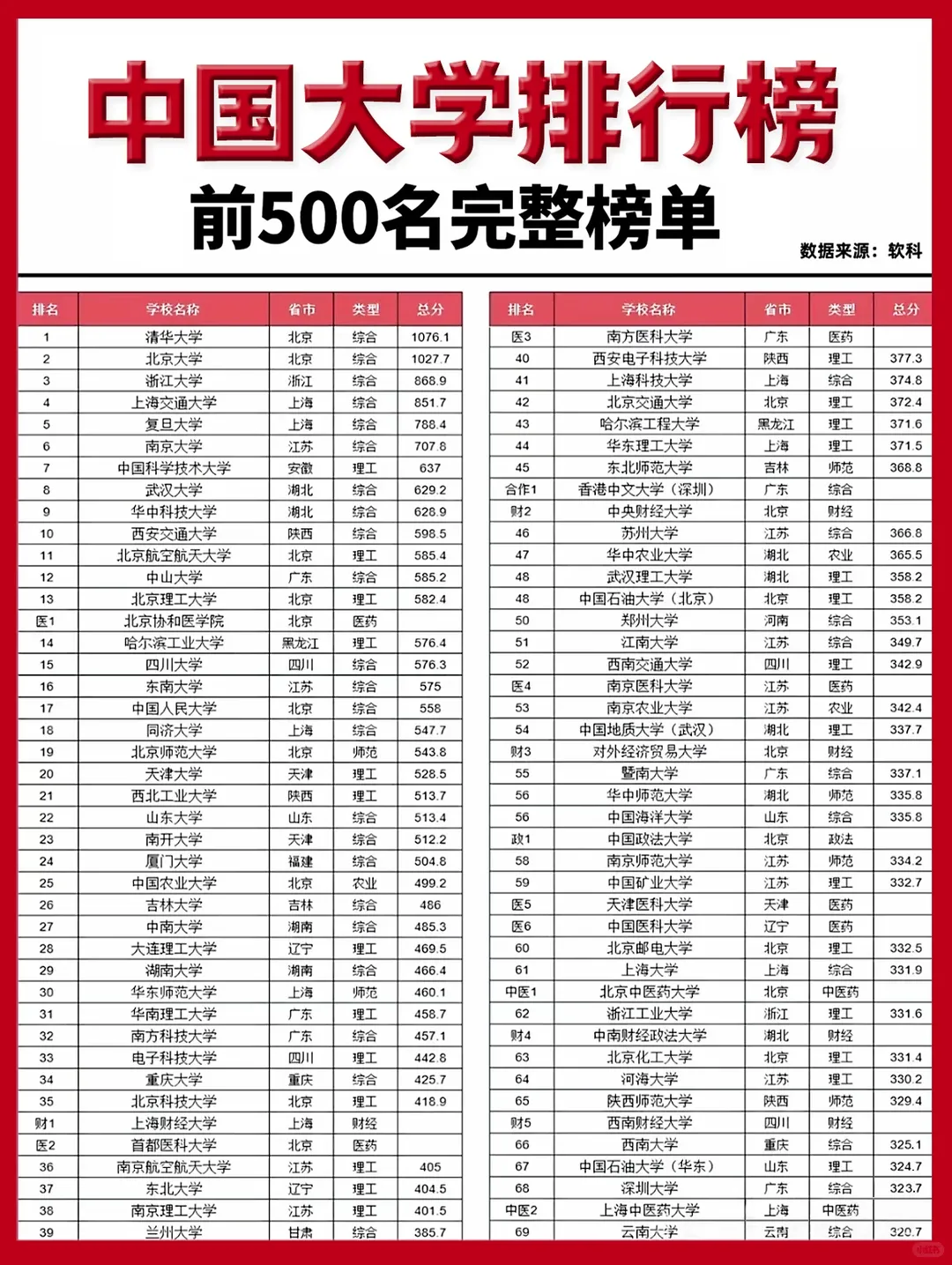 2026中国大学排行榜,前500名完整榜单,参考2025数据,选这些大学准备没错