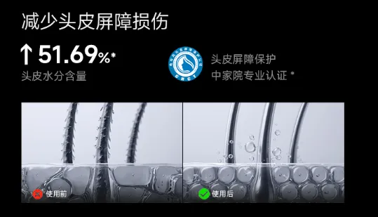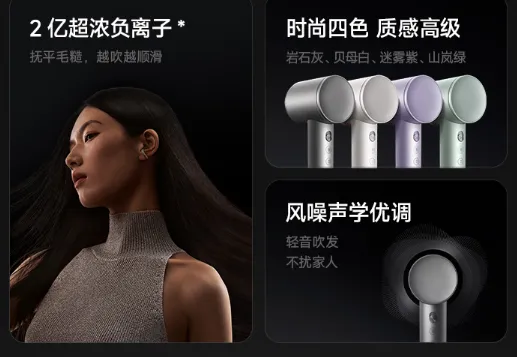 初扉负离子浓度达 8 亿,搭载定向链式负离子渗透技术,小粒径负离子能深入发芯,配合水润负离子膜、链式深导渗透技术,吹后头发顺滑度大幅度提升,而且避免了发丝打结的情况,连续使用 1 周后光泽度明显改善。