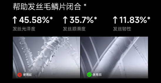 √ 小粒径负离子深导渗透,闭合毛鳞片改善干枯毛躁;