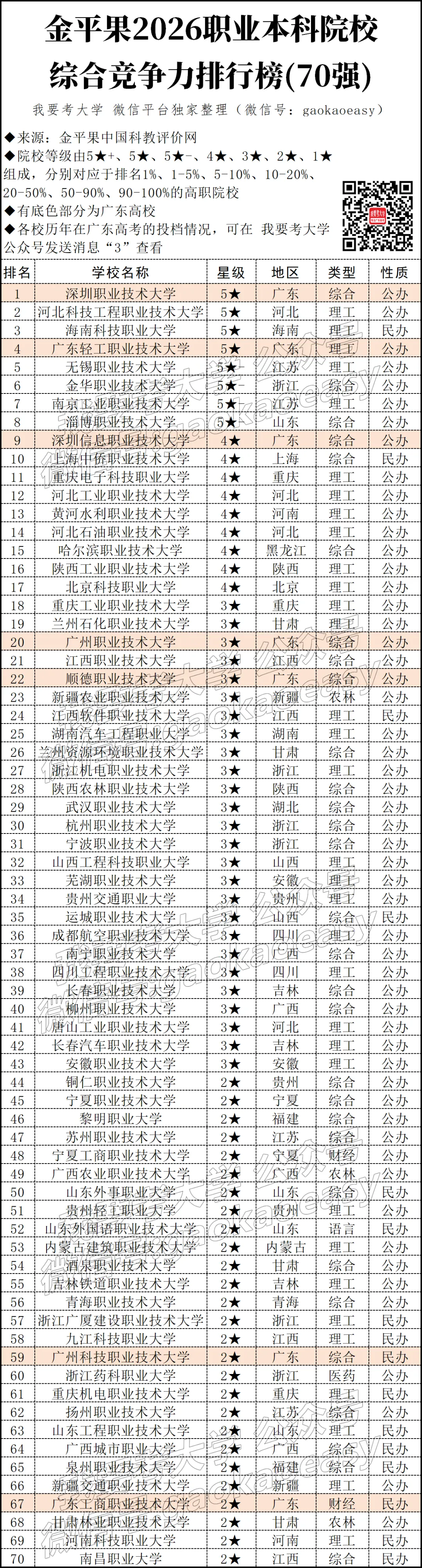 广科、广铁、广机电、广交4校冲进全国80强,拿下5★;水电职院、农工商2校刚好把守住全国百强的入口;广民航、广工贸等6校也顺利进入全国160强(5★-)。