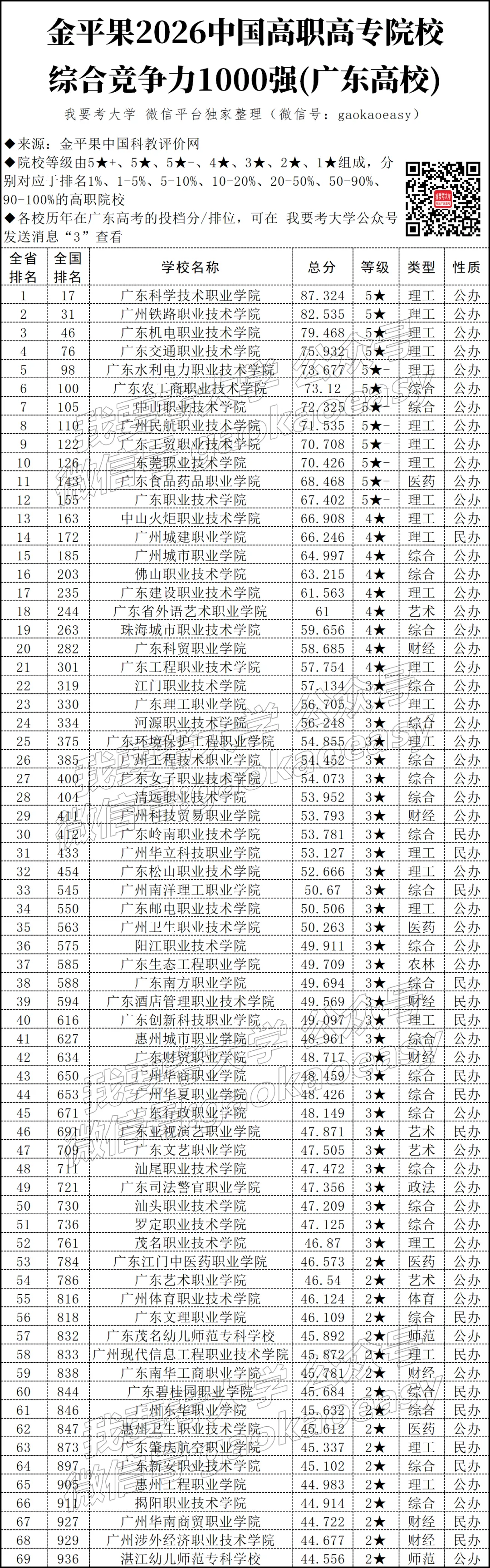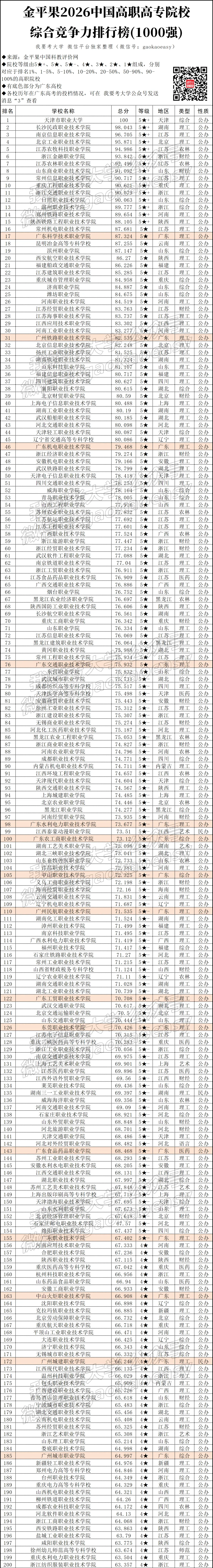 广东共69所专科院校进入全国1000强,包含51所公办、18所民办。