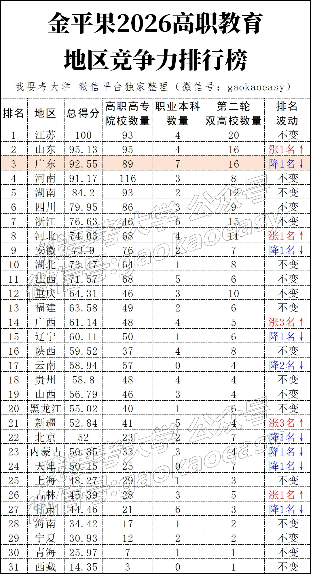 江苏、山东、广东、河南、湖南位居前5,高职教育整体水平有优势。