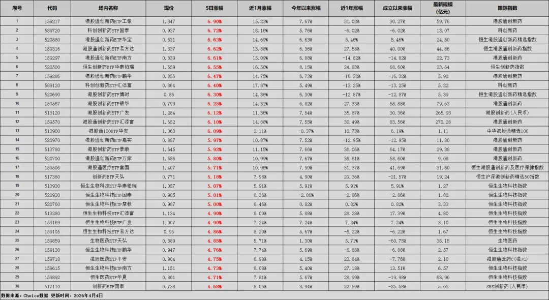 最近5个交易日,创新药板块简直是霸屏状态。你看涨幅榜前15名,清一色全是创新药相关的ETF——港股通创新药、科创新药、恒生创新药,涨幅普遍在6%到7%之间。工银的港股通创新药ETF(159217)涨了6.9%排第一,国泰的科创新药(589720)涨6.72%紧跟其后,整个医药板块的反弹力度非常猛。