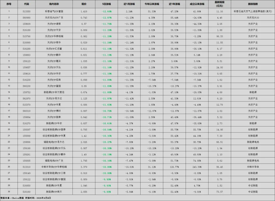 标普油气ETF(513350)5天跌了12.68%,成了跌幅榜第一。光伏板块更是重灾区,广发、浦银、平安、华泰柏瑞……几乎所有基金公司的光伏ETF都在跌,跌幅普遍在11%到12%左右。光伏这波确实伤人气,连跌了好几天。
