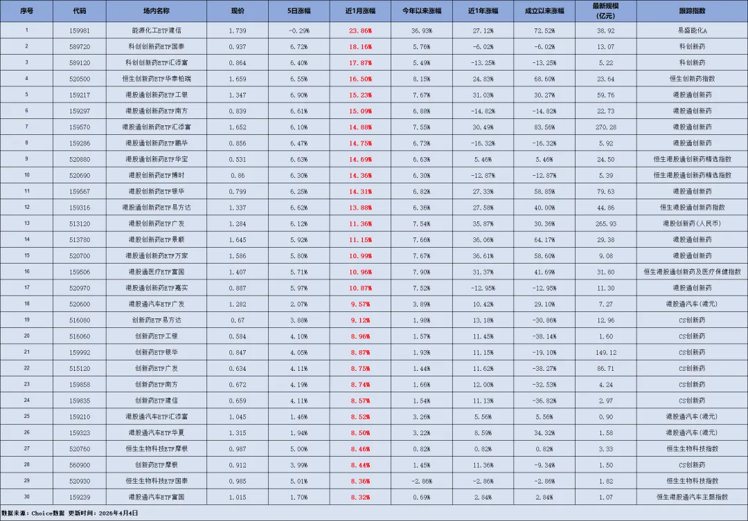 拉长到一个月看,涨幅冠军是建信的能源化工ETF(159981),涨了将近24%。这个产品跟踪的是易盛能化指数,最近原油、化工品表现不错。创新药在这一个月里也继续走强,科创创新药、恒生创新药涨幅都在16%-18%区间,比5日涨幅还大,说明这波上涨不是短线脉冲,有持续性。