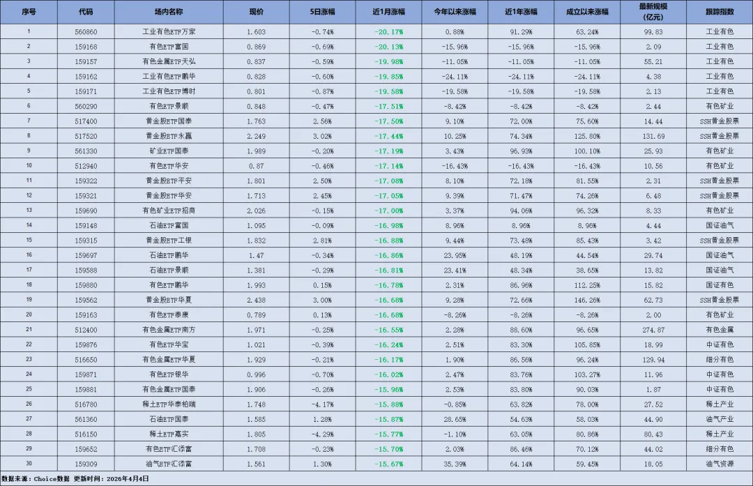 但跌幅榜这边就有点触目惊心了。工业有色、有色金属、黄金股类的ETF近一个月普遍跌了15%到20%。万家的工业有色ETF(560860)跌了20.17%,富国有色ETF跌20.13%,天弘有色金属跌近20%。黄金股ETF也跌了17%左右。之前有色和黄金涨得猛,这个月算是深度回调了。