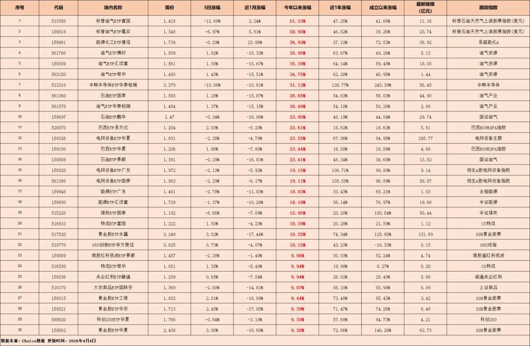 从今年整体来看,油气类ETF绝对是最大赢家。富国标普油气ETF(513350)年内涨了51.33%,嘉实标普油气涨50.95%,建信能源化工涨36.93%,还有好几个油气ETF涨幅都在35%以上。中韩半导体ETF也涨了31%,表现不错。