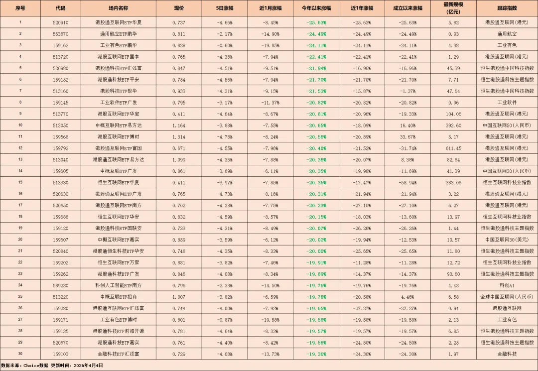 但有人欢喜有人愁。跌幅榜第一名是华夏的港股通互联网ETF(520910),年内跌了25.63%。通用航空、工业有色、港股互联网、中概互联……这些板块今年普遍跌了20%以上。工业有色ETF年初至今跌了24%左右,和近一月跌幅差不多,说明这波下跌是从年初就开始的,最近一个月只是延续。