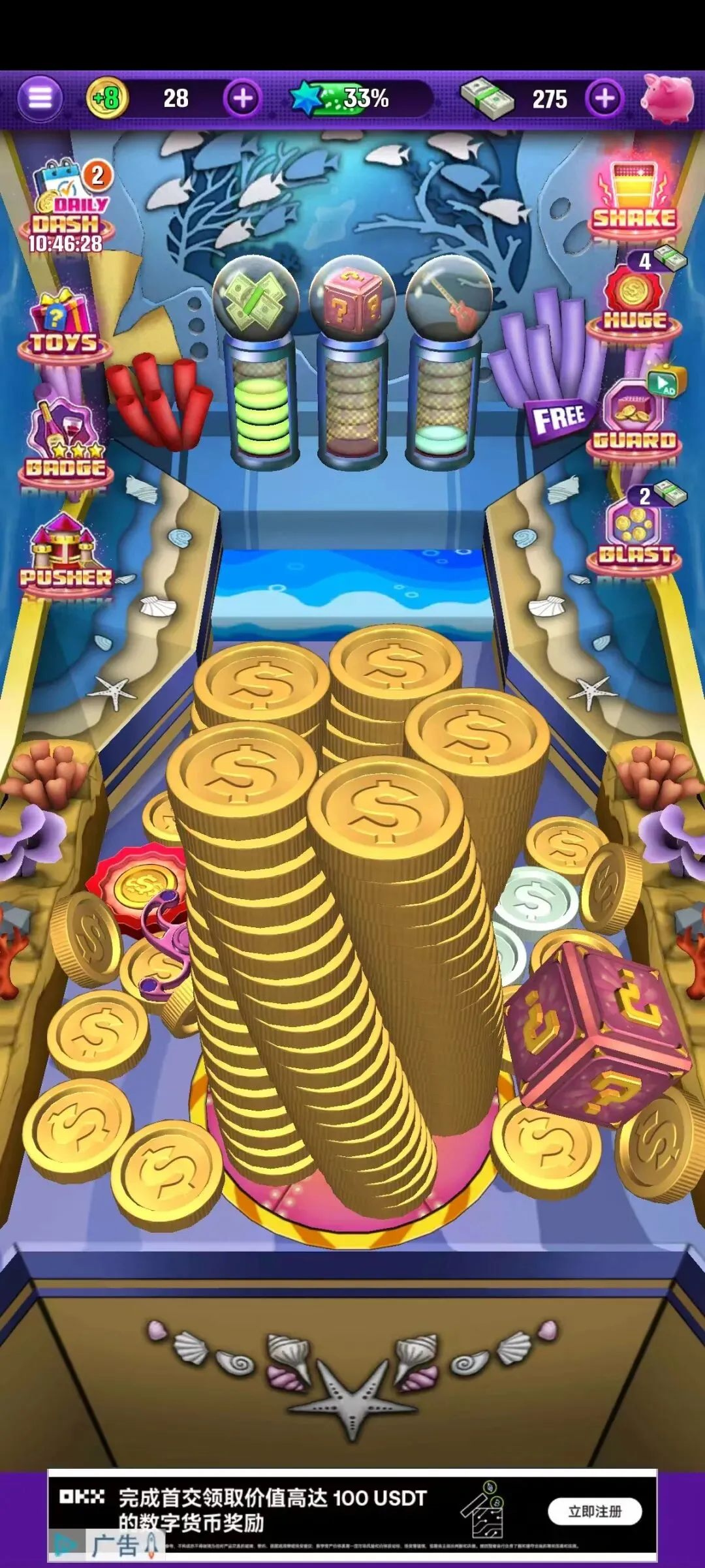 Coin Pusher的道具多了一个金币塔,每次推倒金币塔都会特别爽快。
