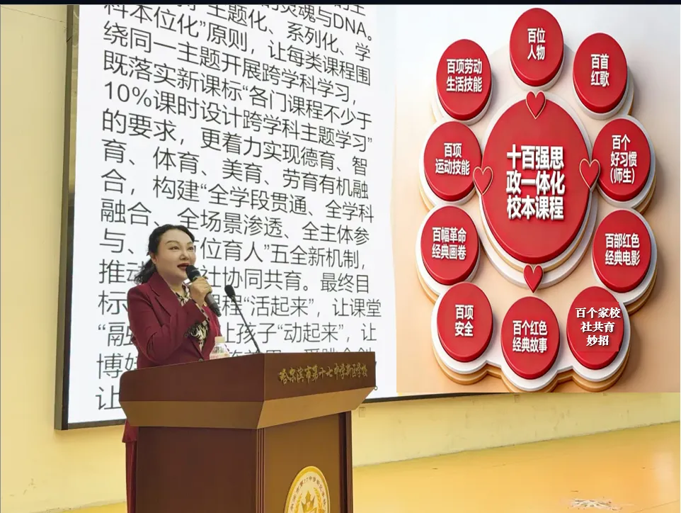 邰慧副校长首先满怀热忱地介绍了“十百强”思政一体化校本课程的体系,作为九年一贯制学校,学校始终坚守育人初心、遵循学生成长规律,立足校本实际深耕 “十百强”课程建设,全力破解思政教育碎片化、载体单一、协同不足等现实问题,推动思政教育真正从课堂走向生活、从理论走向实践。学校以人物戏剧节、红歌节、科技节等十百强课程为重要载体,构建起 “五三三三十” 课程体系,坚持全学段贯通、全学科融合、全场景渗透、全主体参与、全方位育人,让十大思政育人价值引领润育无声,引导全体师生全面提升素养,让课程活起来、课堂融起来、孩子动起来,真正实现以文化人、以艺润心。她表示,本届人物戏剧节是学校 “十百强” 百位人物课程的生动实践与精彩呈现,孩子们以本色登台、原生态展示的模样诠释成长本真,也恳请各位领导、家长与专家多提宝贵意见,助力学校在思政育人的道路上持续完善、行稳致远。