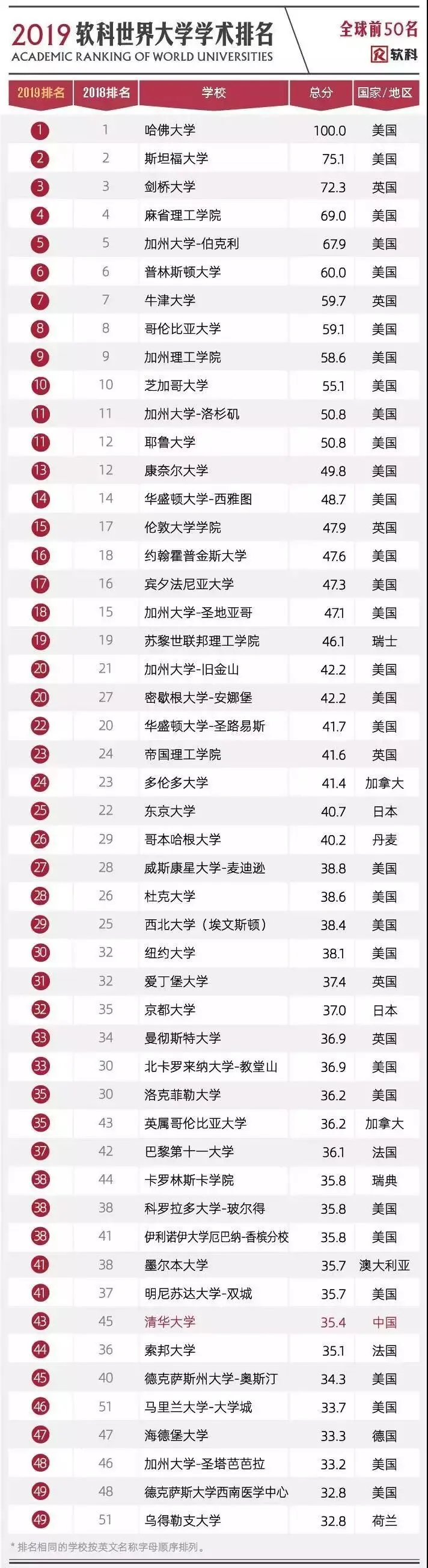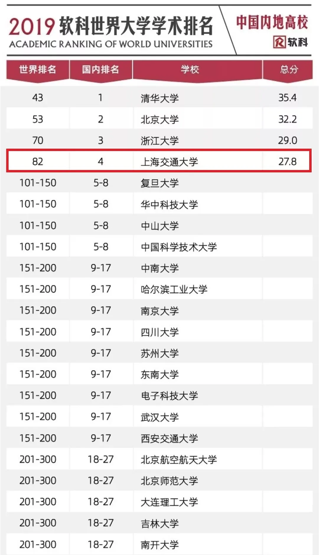 2019软科世界大学学术排名于2019年8月15日18时正式发布。排名展示了全球领先的1000所研究型大学,中国内地共有132所大学上榜,上海交通大学首次跻身世界百强,位列世界第82。