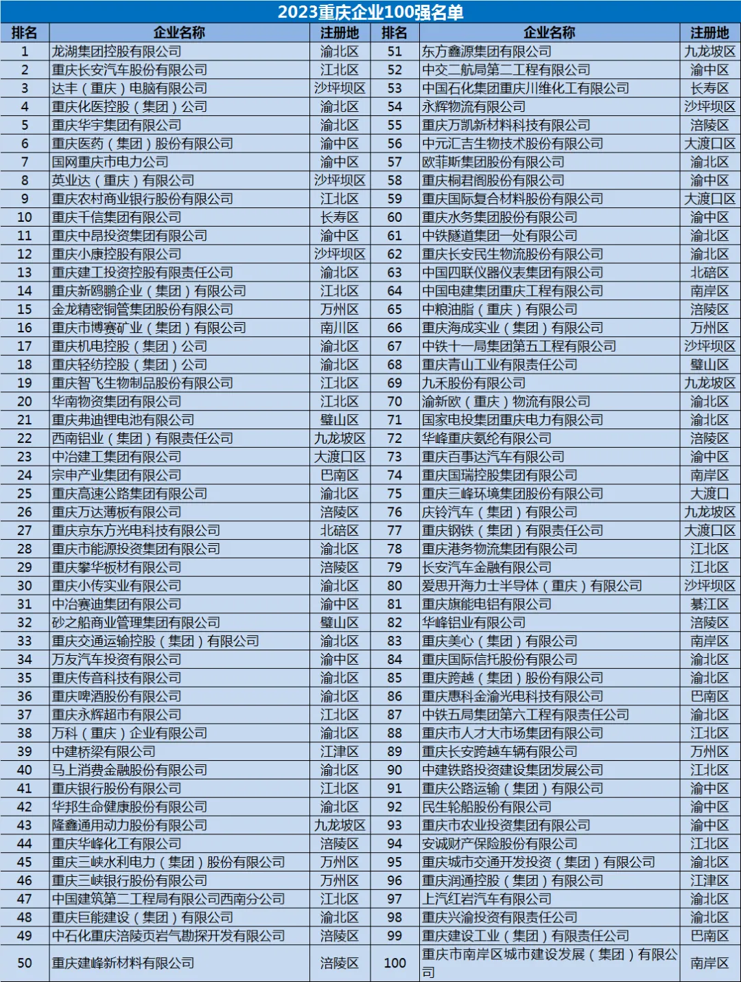 2023重庆企业100强是根据中国企业联合会制定的中国企业500强的标准,经企业自愿申报,按照2022年企业营业收入从大到小依次排序产生。