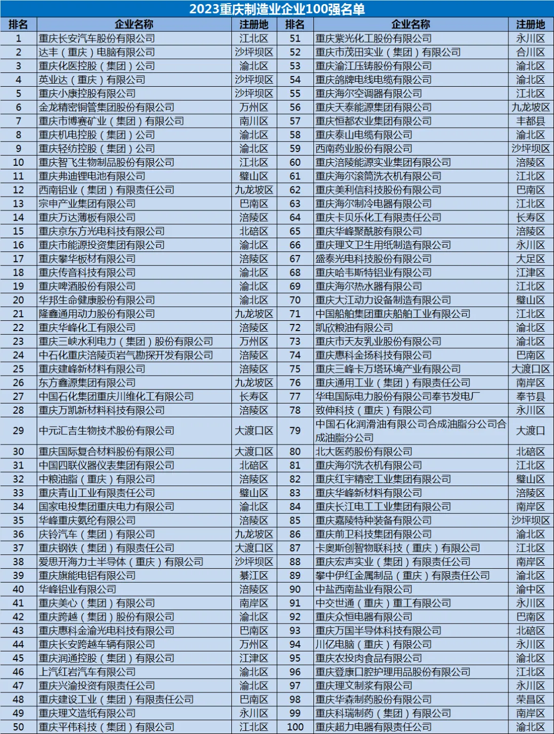 2023重庆制造业企业100强名单
