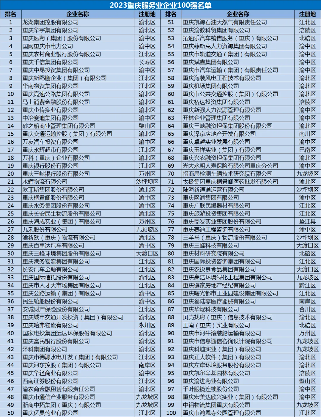 2023重庆服务业企业100强名单