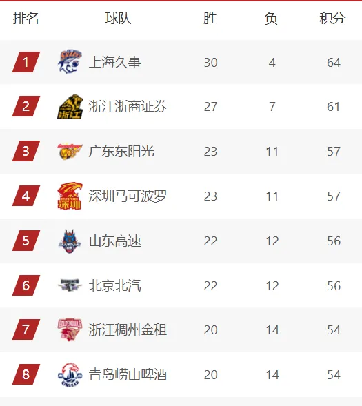 积分榜第7名则属于浙江队,第8名则是青岛队,他们的战绩都是20胜14负。积分榜第9名则是宁波队,这一轮比赛他们30分大胜山东队以后,战绩提升到19胜15负,距离队史第一次季后赛又进一步了。山西队这一轮比赛在客场掀翻了新疆队,成功将战绩提升到18胜16负,排名也直接反超辽宁队,冲上了积分榜第10名。而四冠王辽宁队,他们则被挤出前十名,下滑到积分榜第11名。