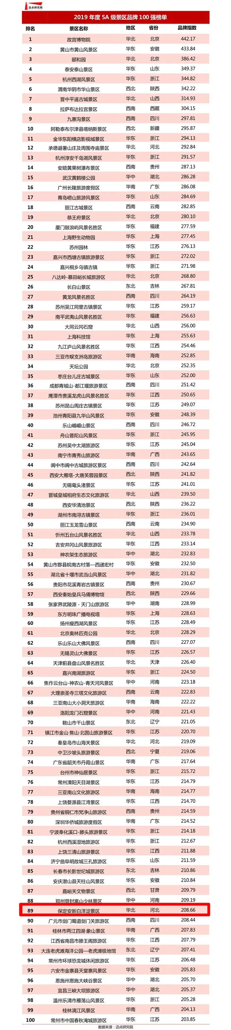 该榜单综合了全国268个5A级景区数据,从搜索指数、舆情指数、运营指数、媒体指数4个方面分析了景区品牌在互联网和移动互联网的影响力。而根据榜单数据,2019年度全国5A级景区品牌整体业绩平缓,区域品牌分布中,南方以山岳、山水自然景观为主,北方历史人文景观占比较大。其中影响力排名前十的景区分别是故宫博物院、黄山市黄山风景区、颐和园、泰安泰山景区、杭州西湖风景区、渭南华阴市华山景区、晋中平遥古城景区、拉萨布达拉宫景区、九寨沟景区、阿勒泰布尔津县喀纳斯景区。