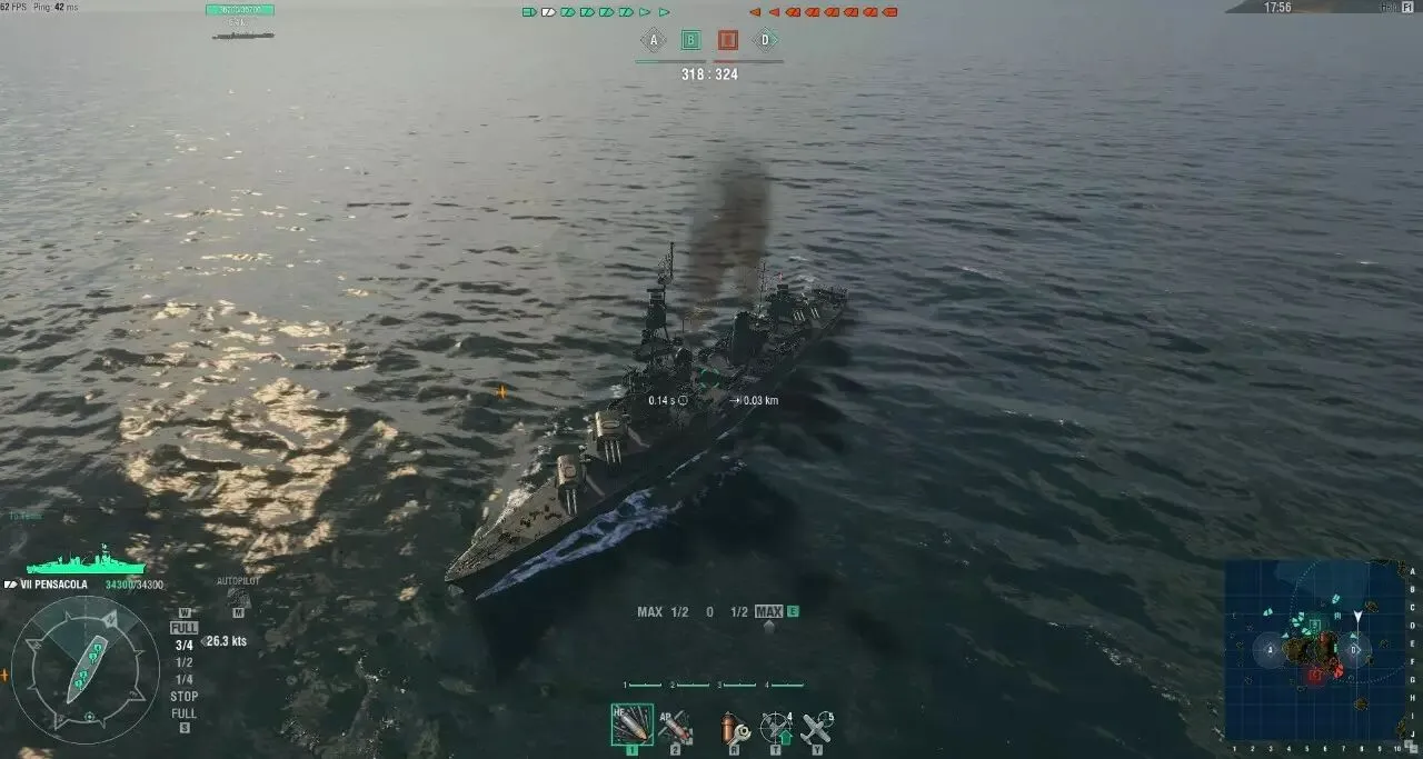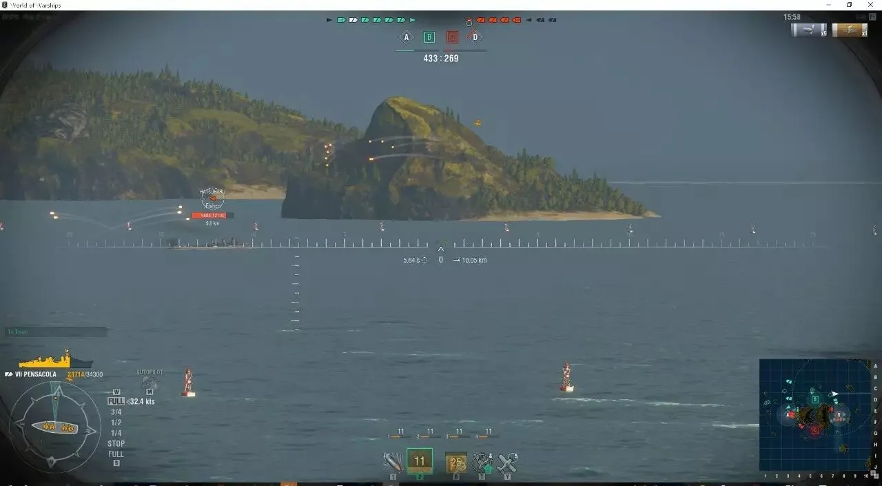 所以这也是一个很好的提示,只要自己一亮就能提早判断进行规避机动,凭借着超一流的机动(转舵时间带上配件完全体转舵只需要5.9秒,转弯半径更是7级最小)在岛屿之间灵活的穿梭(7级巡洋独此一艘)。这么做一是可以利用地形的隐蔽一定限度地防止被战列舰中出,二来如果有敌方驱逐舰也在岛屿中可以利用小地图来判断敌方驱逐舰走位的大致方向。