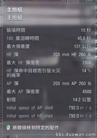这是彭萨科拉白板炮的数据。炮弹初速只有792m/s加上美系的“抛石机”弹道,新手们在攻击远距离目标时会感到比较困难。对比日系从古鹰到伊吹的传家宝203,炮弹初速都是840m/s,另外日系弹道一直比较平滑,所以会产生日系炮弹飞的比美系快很多的错觉。