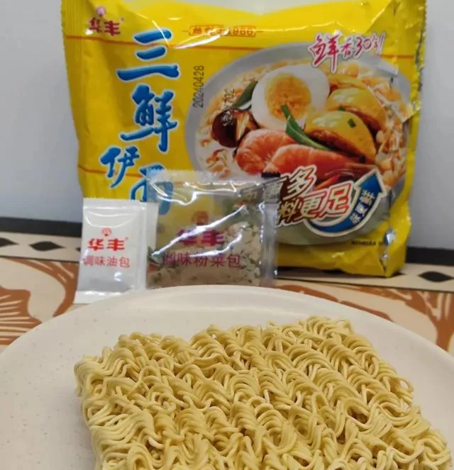 袋子里这一块叫华丰三鲜伊面,黄灿灿的一把干面条,配两三小包粉包和油包,九十年代五角一包,买回家直接开水一烫,油香味马上窜起来,**“食华丰路路通”**那句广告语当年可是一喊家家认,煮面的时候家里小孩围着锅底打转,弟弟总忍不住偷捏一撮干面嘎嘣脆着嚼,妈妈有一次笑着拿筷子打我手“就知道偷吃,碗里还没下锅呢”,现在的方便面花样百出,可那种纯粹的面香和小时候三鲜味,怎么吃新牌子都补不回来。