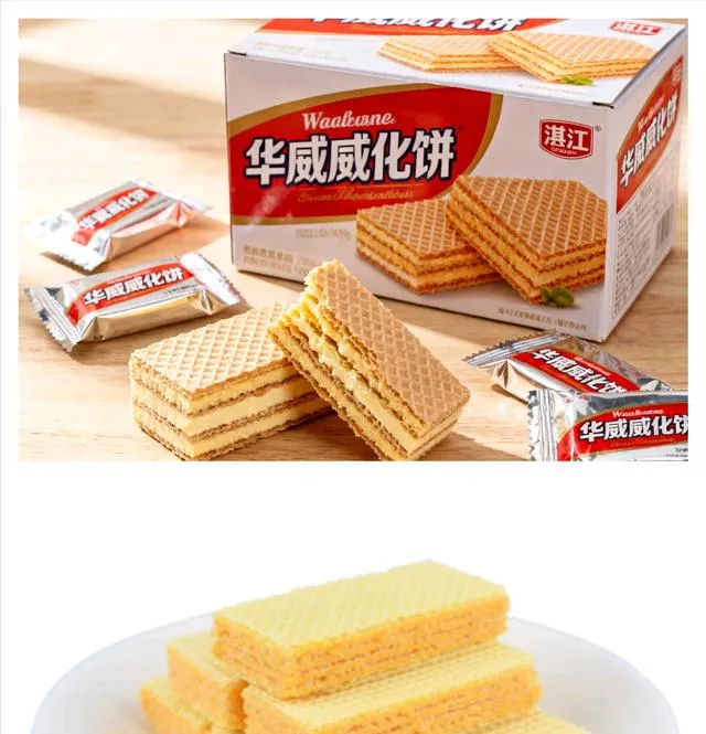 桌上这块就是华威威化饼,薄薄多层,中间裹着花生味或者巧克力酱,小时候放学回来抽屉里要翻出来一包真实在,奶奶总碎碎念“便宜又顶饿,嘴馋小孩都喜欢它”,咬下去嘎吱一声,满嘴香甜,和电视广告里“一条大道都香喷喷”说得一样,一盒下去有时都不够分,现在零食柜子琳琅满目,但再没这种淡淡麦香,每层饼干都会掉点渣的踏实口感了。