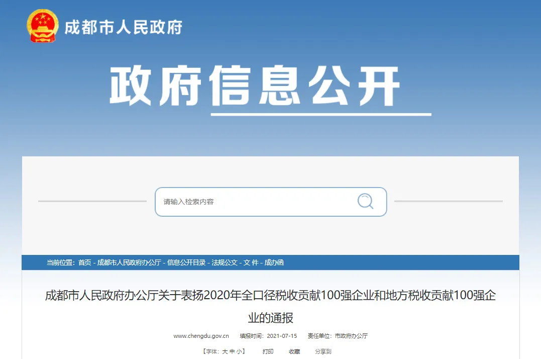 成都市人民政府办公厅关于表扬2020年全口径税收贡献100强企业和地方税收贡献100强企业的通报