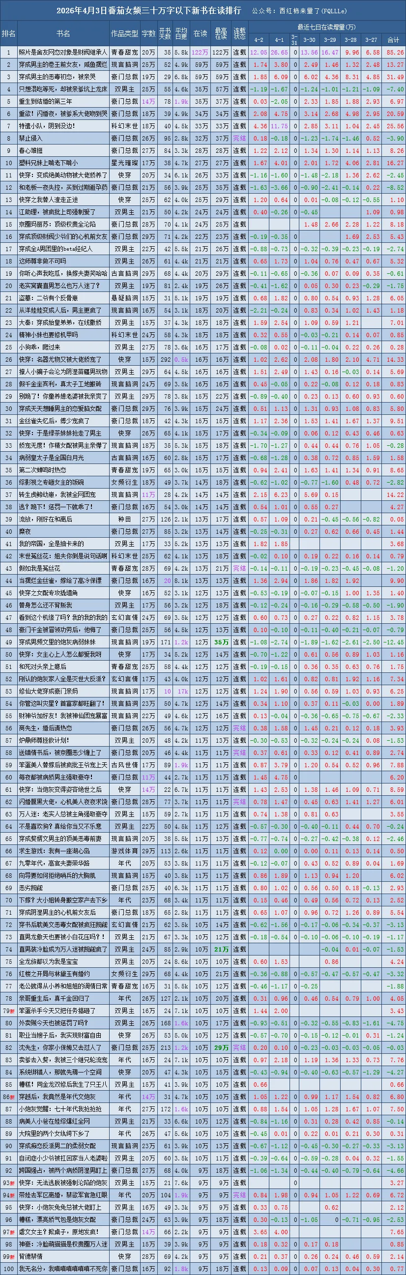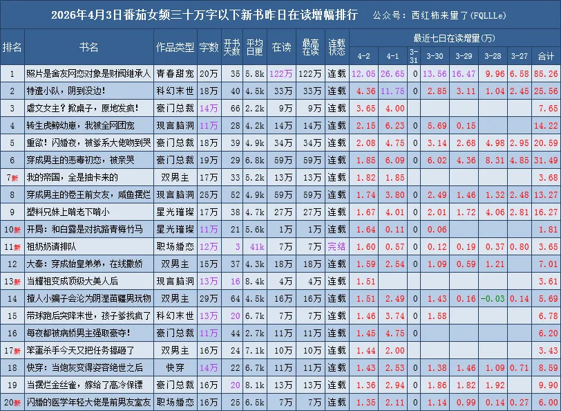 番茄新书榜范围:30万字以下、已签约未下架、已经开始推荐的且未断更,完结未超过90天的番茄原创作品