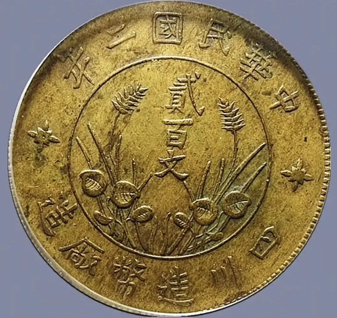 民国二年四川黄铜直缨二百文,PCGS评级XF 45