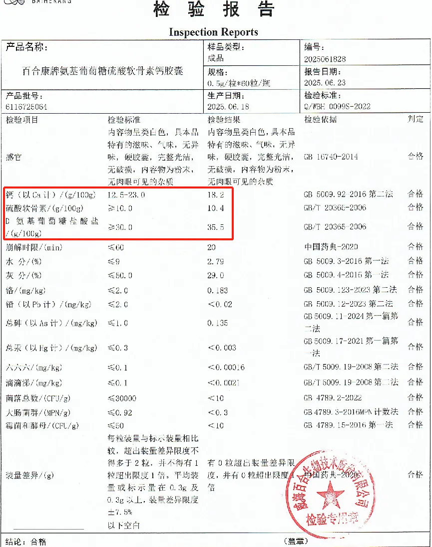 2. 成分硬实力:选用高纯度优质原料,经过严格的低刺激筛选,纯度实测结果行业领先,官方标注每100g含D-氨基葡萄糖盐酸盐30g、钙12.5g、硫酸软骨素10g,实际检测报告显示,每100g含D-氨基葡萄糖盐酸盐35.5g、钙18.2g、硫酸软骨素10.4g,实测含量远超标注值,无任何劣质杂质添加,从源头降低刺激。