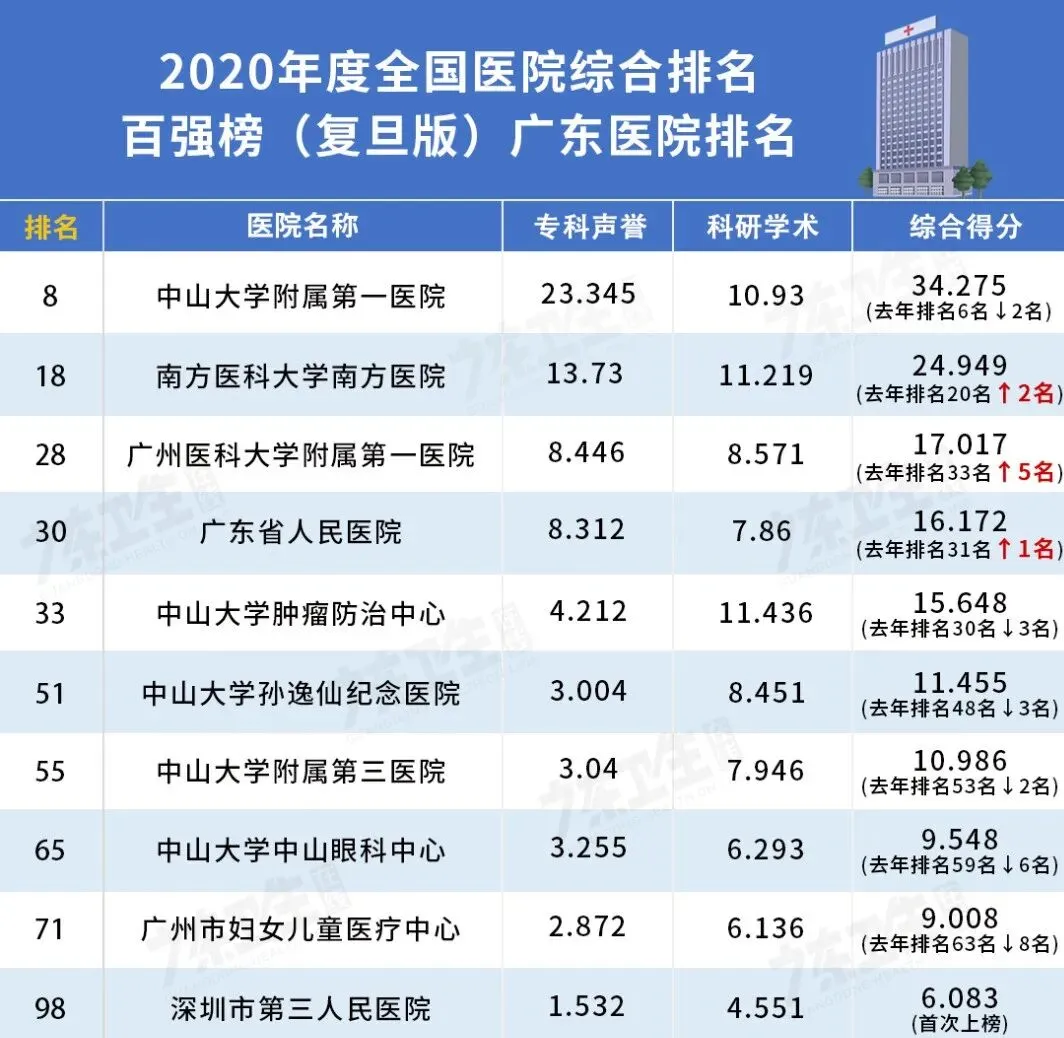 中山大学孙逸仙纪念医院、中山大学附属第三医院、中山大学中山眼科中心、广州市妇女儿童医疗中心也再次进入前100名。