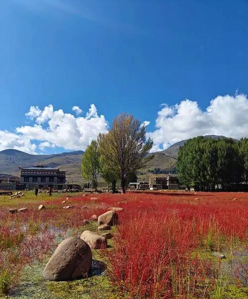 稻城最让人印象深刻的是红草地,每年九月底到十月初,一片片草地会变成红色,红得很特别,不是那种艳丽的红,是带着一点褐色的暗红,配上远处的雪山和蓝天,整个画面有种不真实的美,很多人第一次看到会愣在那,因为那种颜色组合在平原地区是看不到的,那是属于高原的秋天。