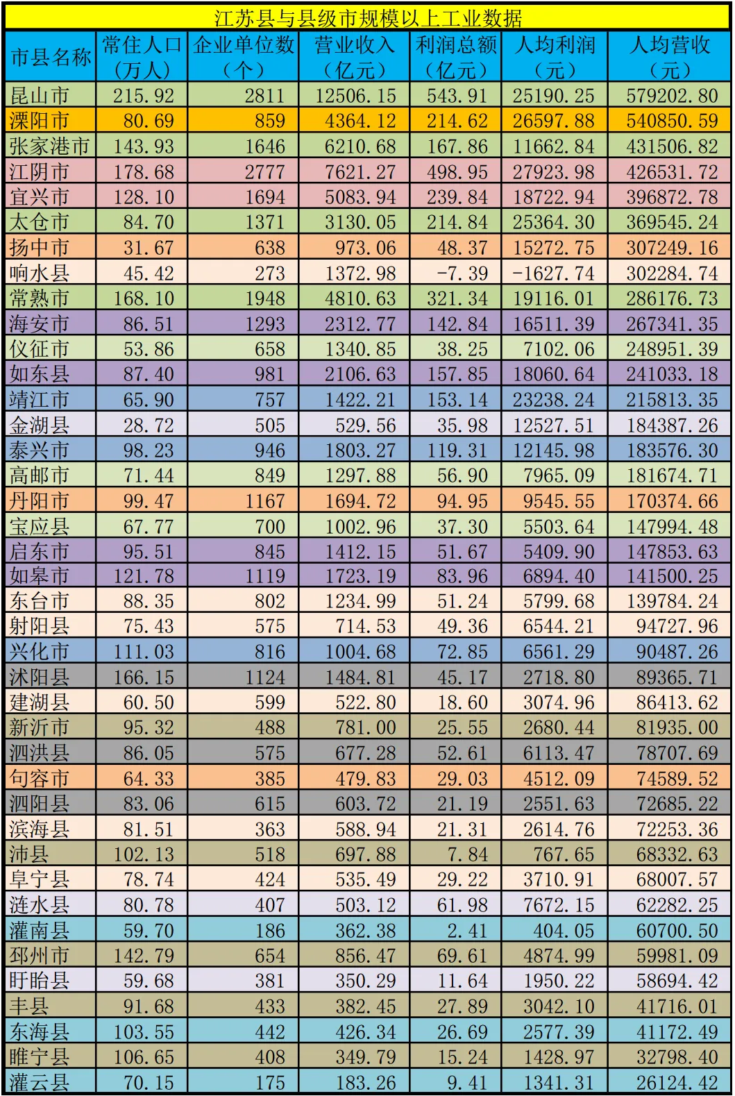 考虑到县及县级市的规模差距很大,下表再按人均营收做了一个排名: