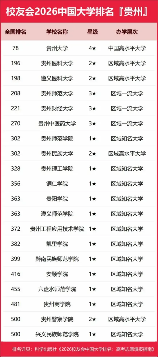 2026年校友会中国大学排名已经公布,贵州省有19所本科院校进入排行榜,虽然不如东部省份多,但是总体上呈现了一种“一本院校领先、二本院校集中、应用型高校慢慢成长”的局面。从排行榜上看贵州大学在全国全省高校排行第七十八位,在贵州省属高校排第一、西南地区高校排前20位左右。紧随其后的是贵州医科大学和遵义医科大学,均以全国第196名、第198名的成绩位列省内第二、第三名,两所医学院校在医学教育及临床实践中有着明显的优点,也是贵州省重要的医疗人才培训基地。贵州师范大学在全国第208名左右的成绩排在省内第四位,是师范类院校的典型代表,对于基础教育师资的培养、区域教育的研究都有着不可替代的作用。除此之外,贵州财经大学、贵州中医药大学、贵州理工学院等高校分别处在221、270、328名左右的位置上,涉及到了财经、中医药、理工等诸多的应用学科领域之中,体现出贵州高等教育对地方经济社会发展服务的多样化安排。从整体上看,贵州高校在全国排名中没有进入全国顶尖高校行列,但是已经形成了比较完备的教育体系,在医学、师范、财经等专业领域具有较强的竞争优势,为西部地区高等教育发展做出了重要贡献。