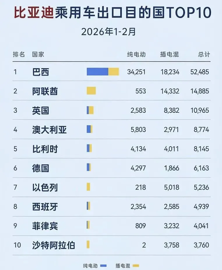 近日,有数据统计了2026年1-2月份比亚迪乘用车出口目的国的TOP10,包含纯电和插混,排行前三依次是巴西52485辆、阿联酋14885辆、英国10965辆。