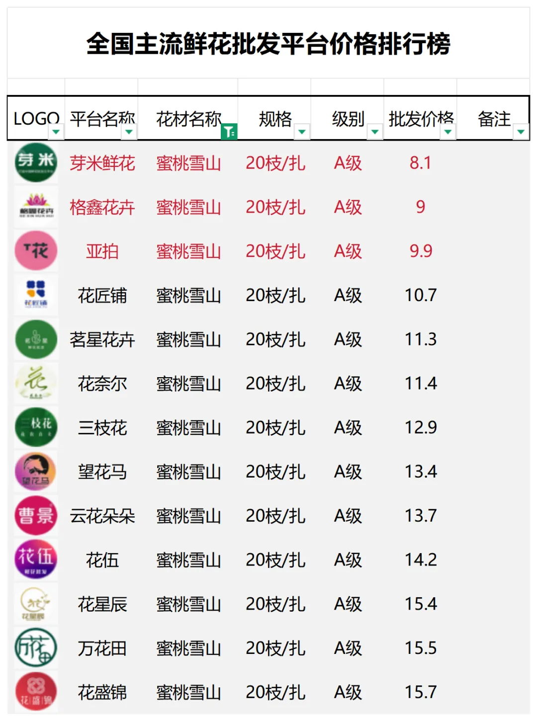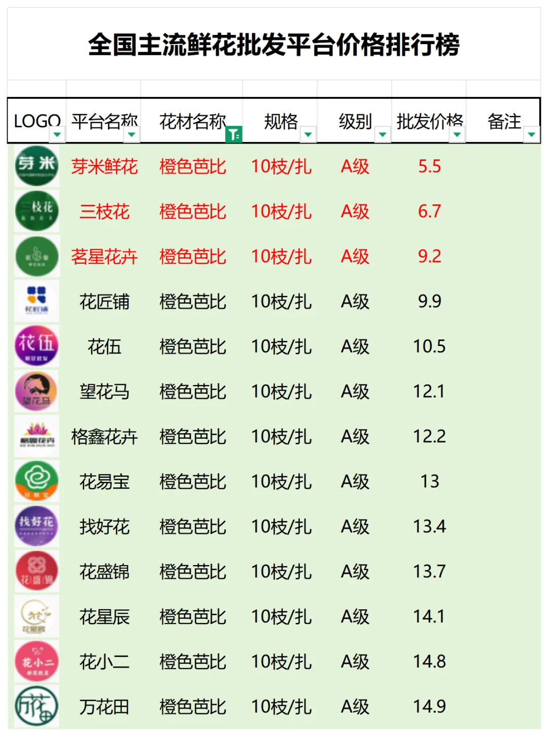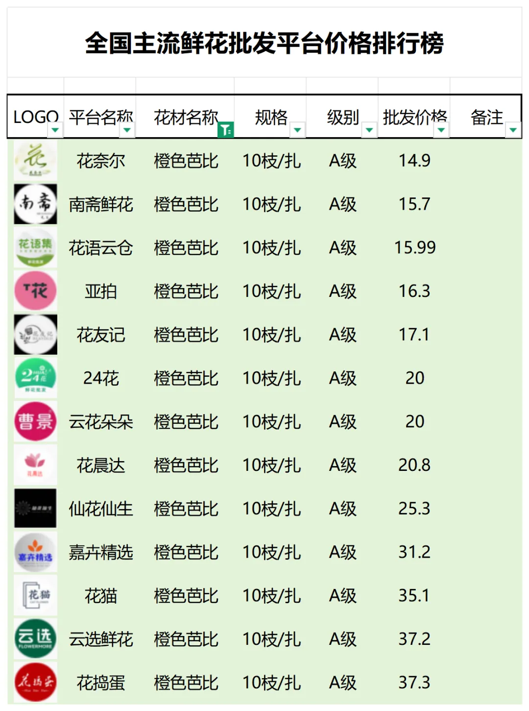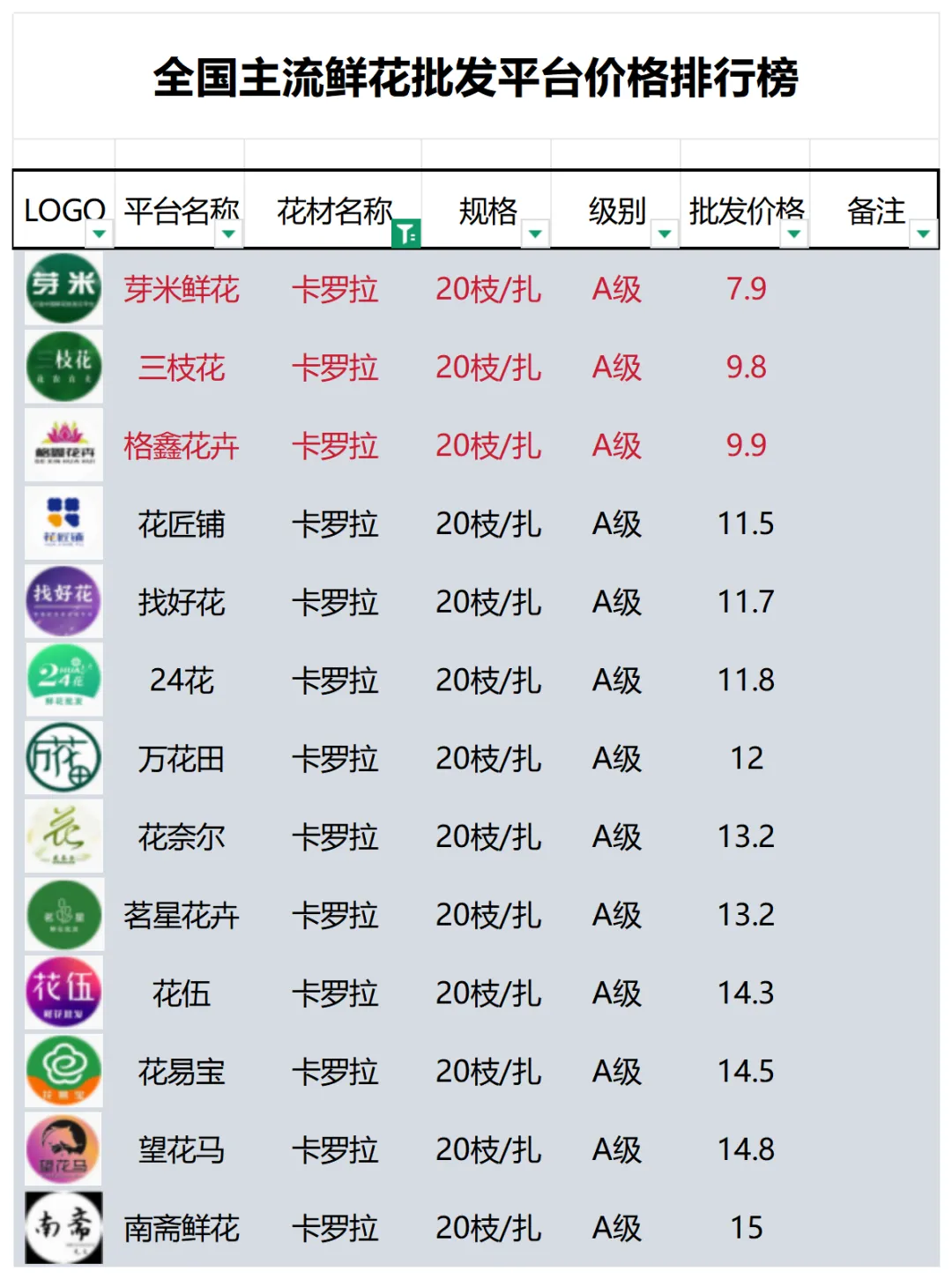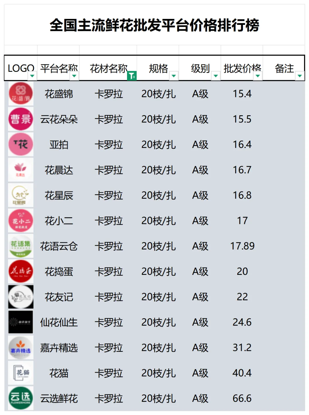 2、本数据只收录A级花材批发价格,覆盖全国大部分主流鲜花批发平台