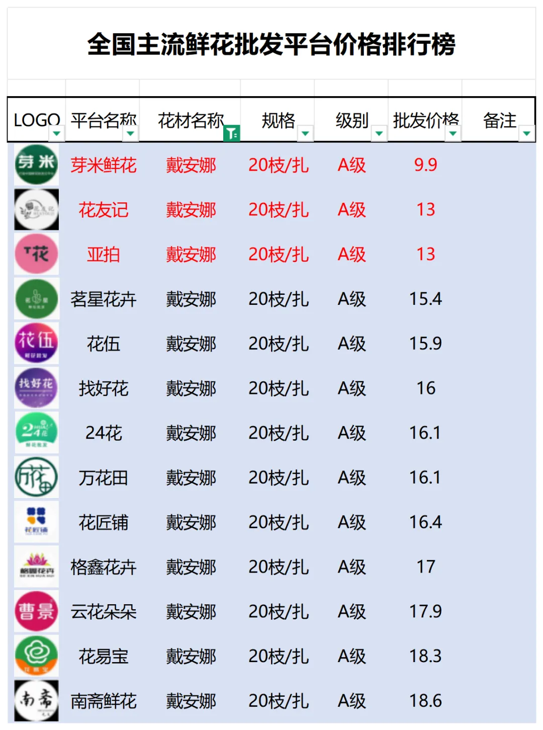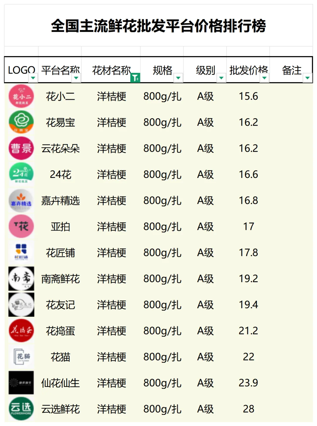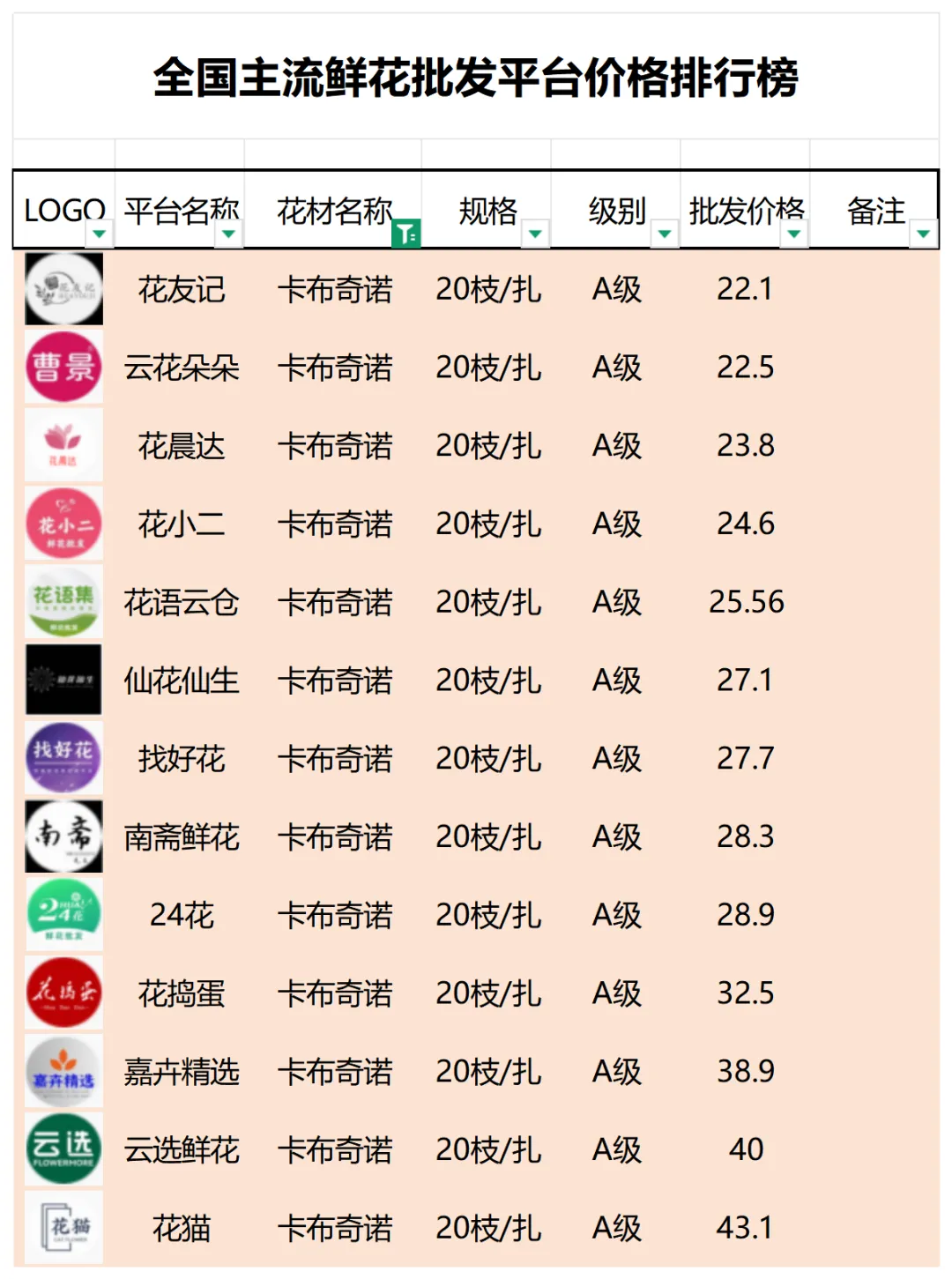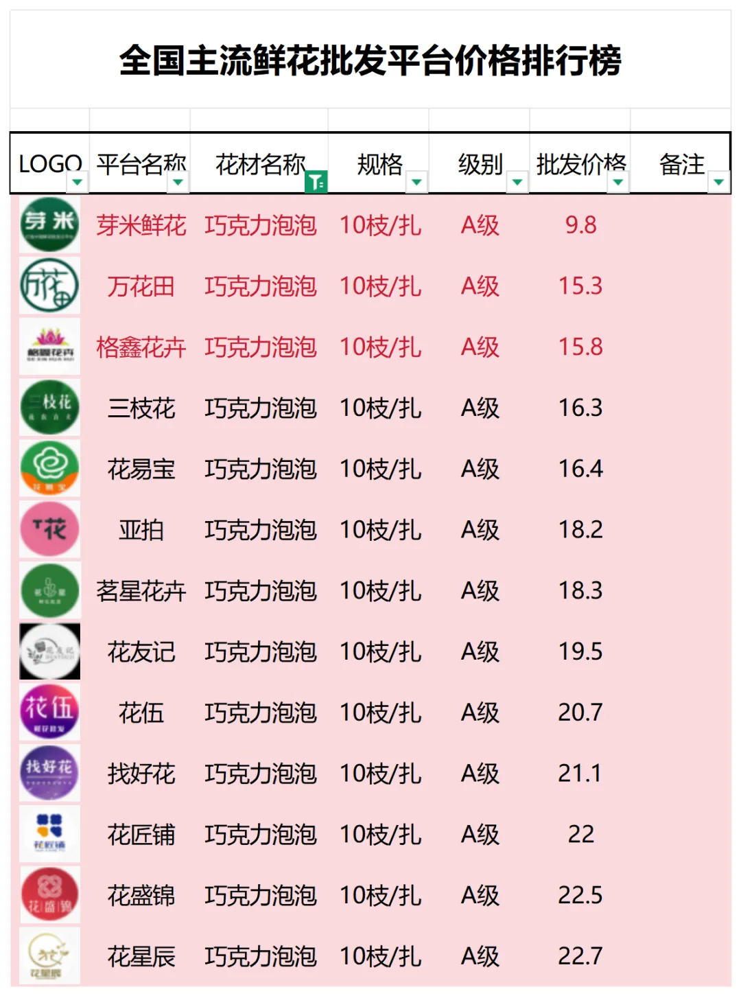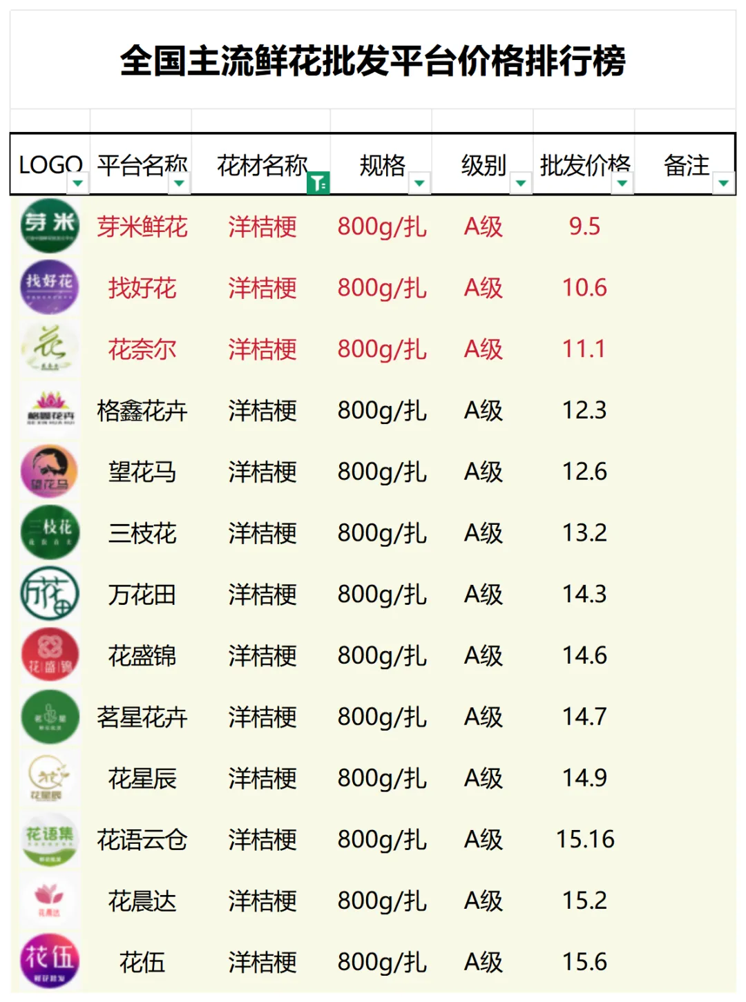 2、本数据只收录A级花材批发价格,覆盖全国大部分主流鲜花批发平台