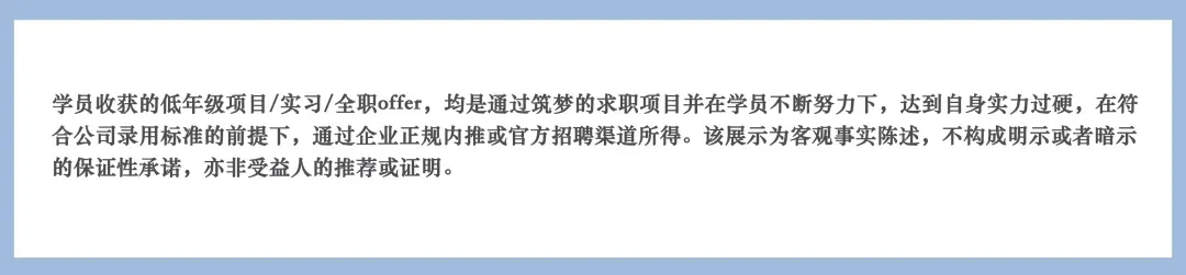 因很多公司的面试都没有通过,学员很有负担,找到我们的时候比较纠结和迷茫,在求职顾问的规划分析下推荐了拥有导师VIP一对一辅导、享有内推机会、big name远程PTA实习的“筑梦计划”项目,同时建议学员国内、国外两个地方同时求职,并为其安排有丰富经验的导师进行辅导,帮助学员增加面试成功率。