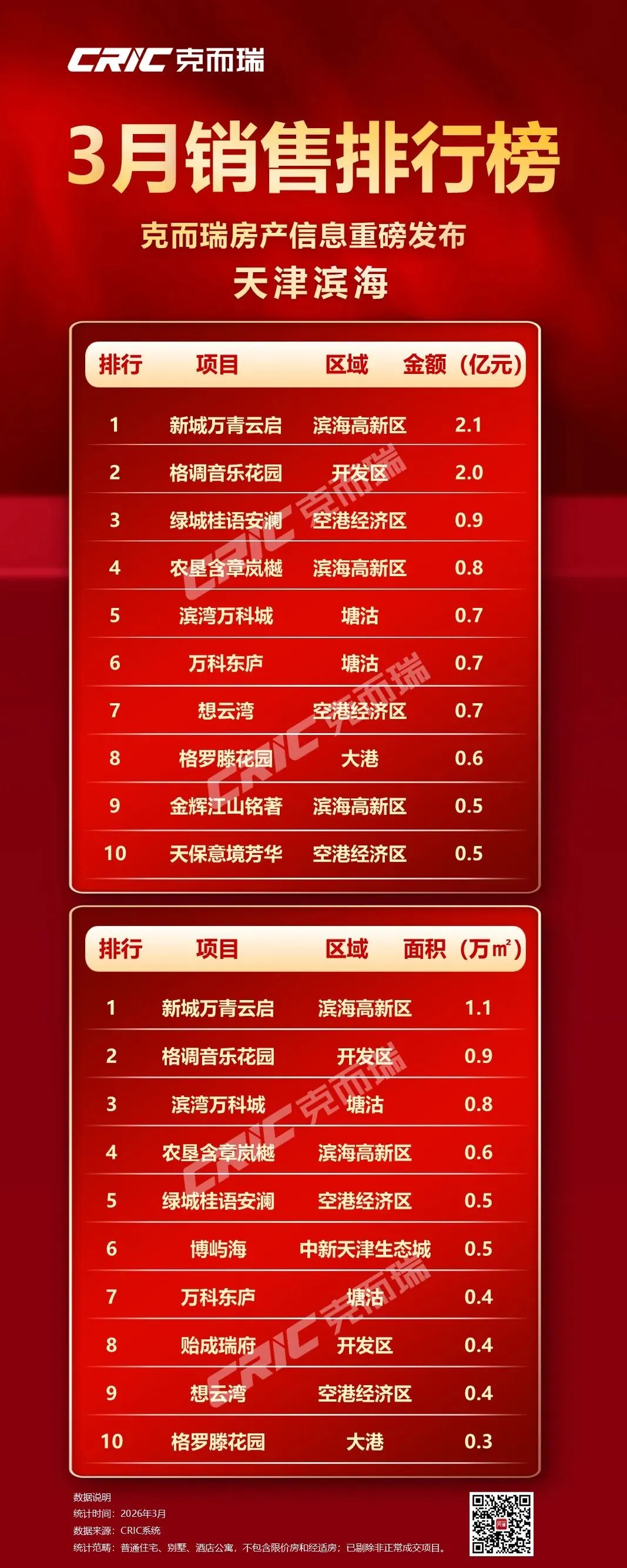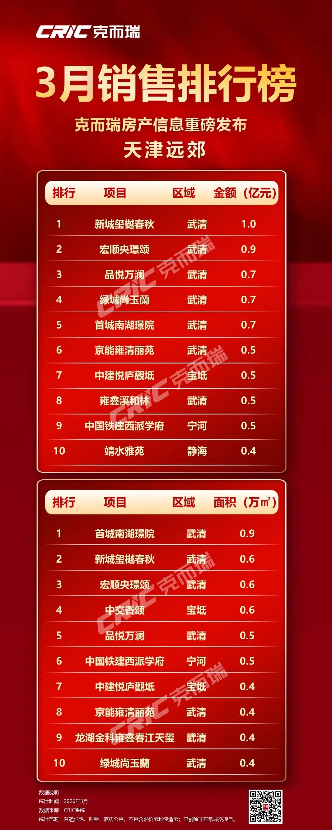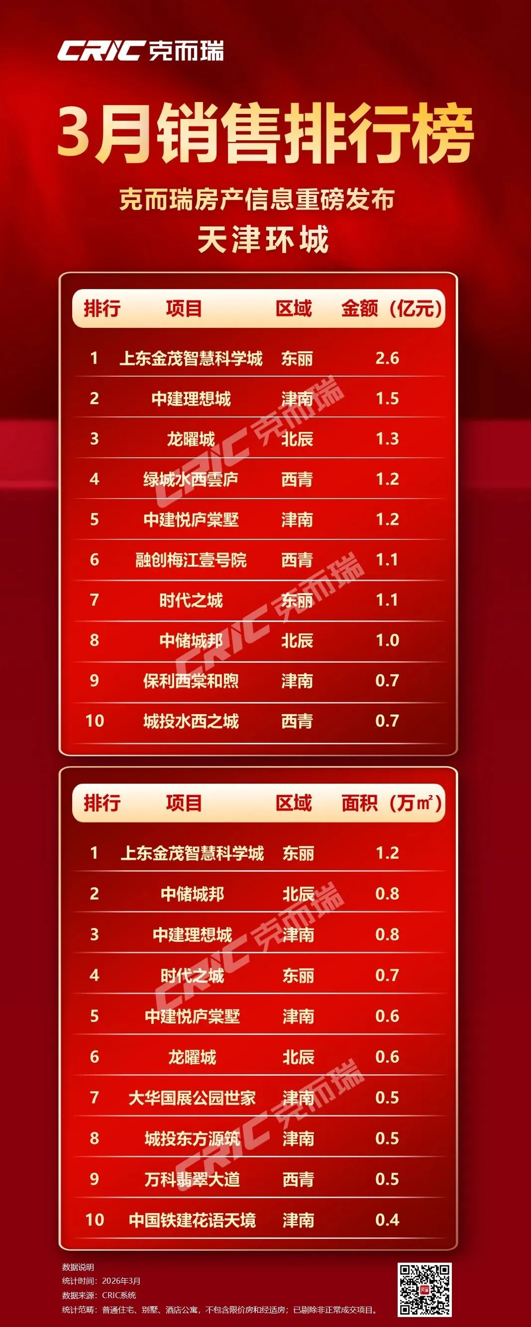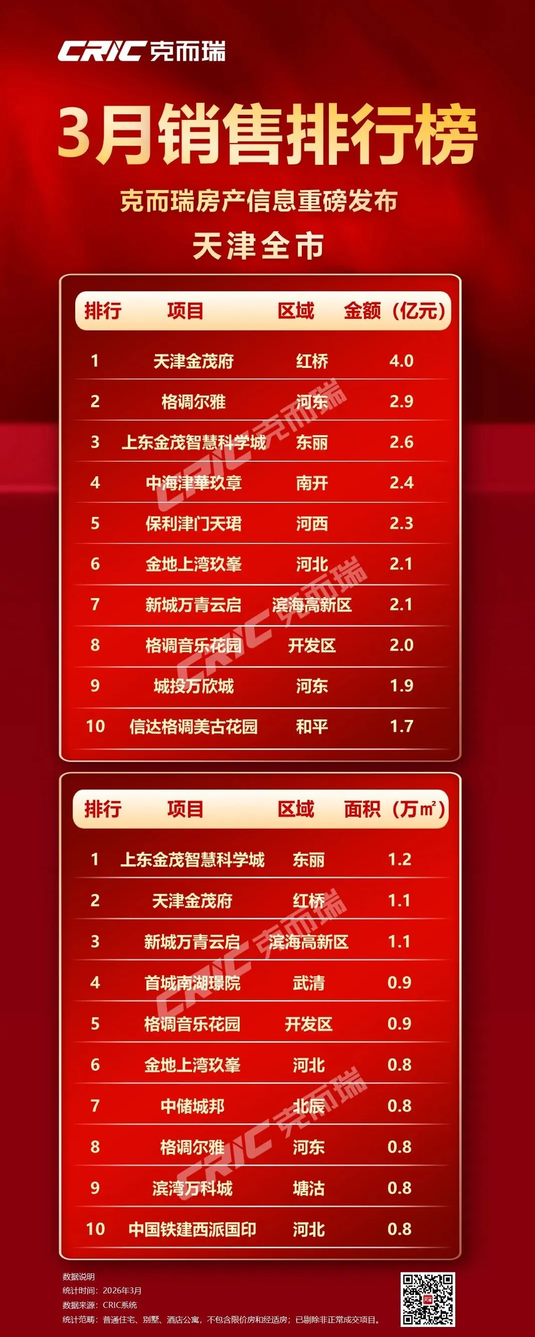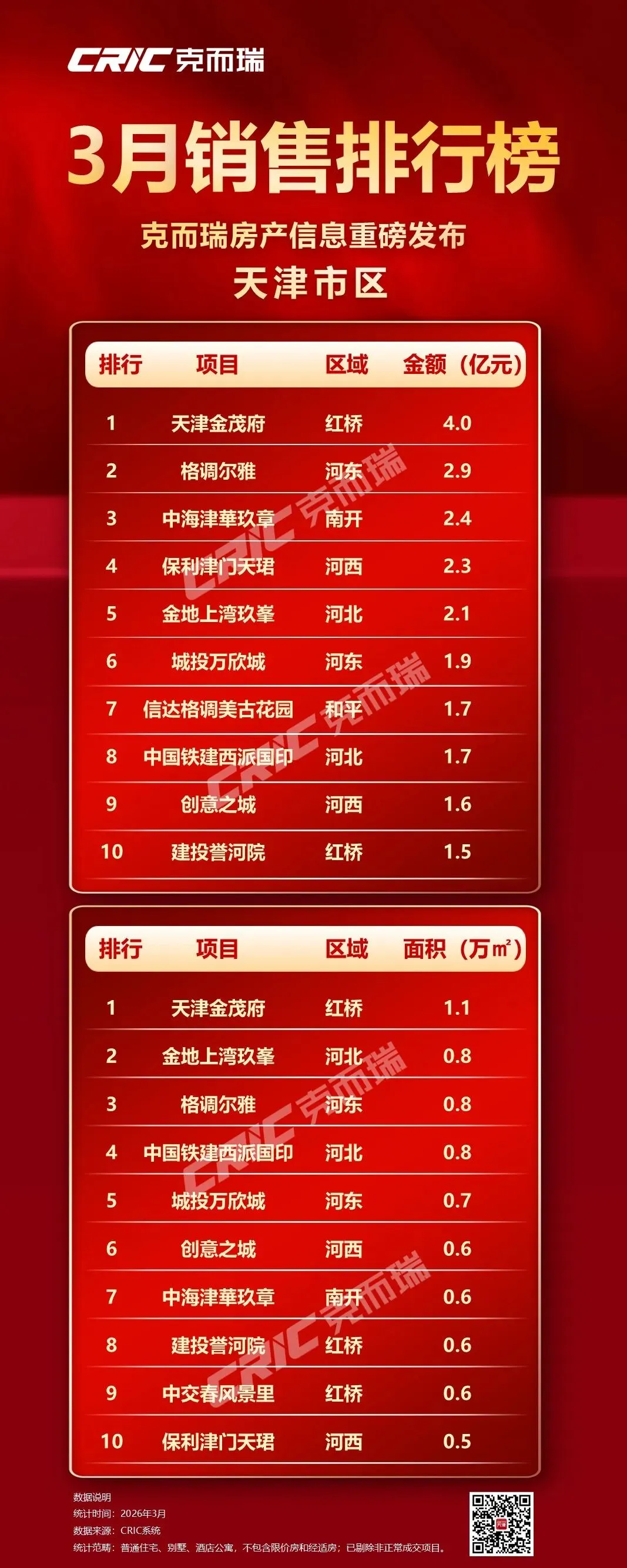 免责声明:克而瑞所发布的“2026年1月项目销售排行榜榜单”系以易居企业集团·克而瑞监测数据公开数据为基础,利用克而瑞第三方测评机构的行业优势和专业立场,通过多维度数据监测、多元化综合评判所生成的天津房企销售排行榜。克而瑞明确表示,上述榜单内容为独立见解仅供参考,克而瑞不对使用上述榜单及其内容所引发的任何直接或间接损失承担责任,且就榜单相关内容享有全部的解释权。