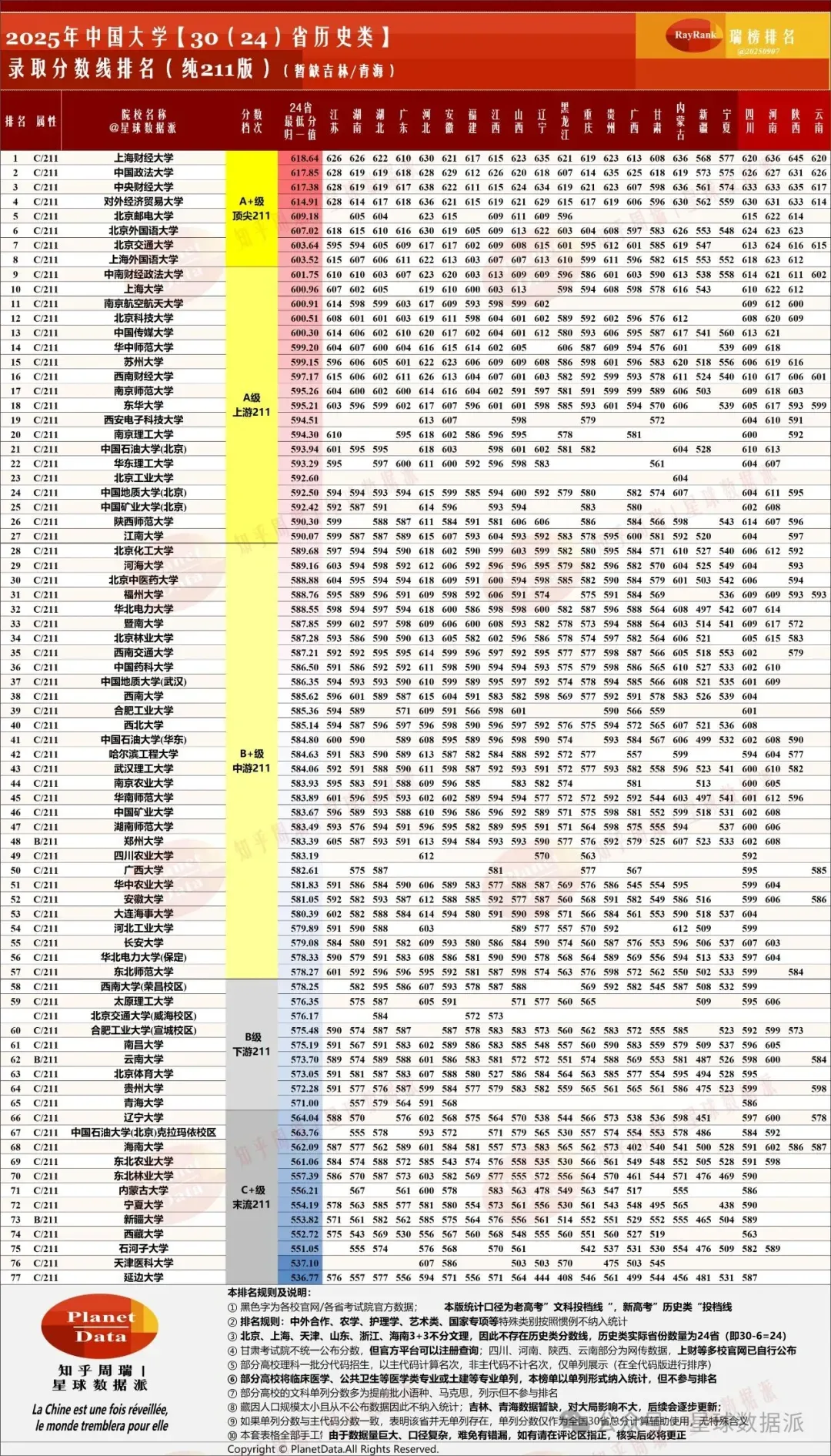 表3、2025年全国30(24)省历史类分数线(211、双一流、四非版)