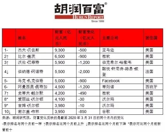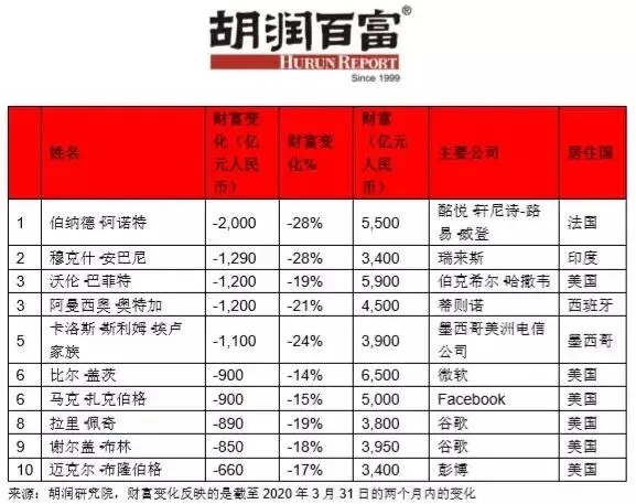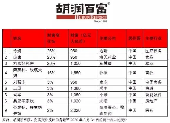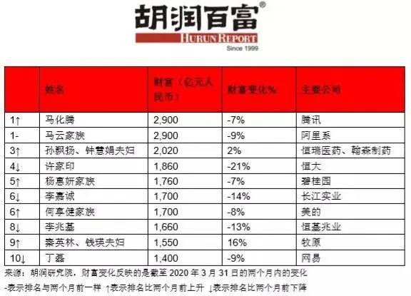 而一个多月前,2月26日公布的2020全球富豪榜上,“马云再次登顶中国首富,马化腾少70亿位居第二。”《疫情两个月后全球企业家财富变化特别报告》研究了胡润全球富豪榜上的企业家在截至2020年3月31日的两个月内的财富变化。在过去两个月里,中国前十名企业家总共损失了2890亿人民币。在绝大多数全球百强企业家财富均有缩水的背景下,马化腾首次与马云并列成为中国首富,二者同样拥有2900亿人民币。近两月,马化腾财富减少7%,马云财富减少9%。年初,中国富豪榜前三甲“二马一许”的格局已被打破。恒瑞医药和翰森制药的孙飘扬、钟慧娟夫妇以2020亿人民币排名第三,超过了许家印和李嘉诚。顺丰王卫则跌出前十。2-3月的两个月里,中国在全球百强企业家中增加了6人,是迄今为止增加最多的国家。印度减少了3人,美国减少了2人。百强企业家中,美国现有34人,中国有29人,中国与美国的差距从13人缩小至5人。不过,全球前10名中,有8名是美国人。“中国是相对的赢家,中国股市比美国和欧洲股市更能抵御新冠肺炎疫情的影响。”胡润百富董事长兼首席调研官胡润表示。过去两个月,全球股市大幅下跌,道琼斯指数下跌21%,印度、法国、德国和英国下跌四分之一,日本下跌18%,港股下跌10%。全球主要股指中唯一上涨的是上证指数,上涨了0.2%。随着疫情在世界范围内扩散蔓延,全球富豪榜也发生了不小的震动。在过去两个月里,全球前十名企业家总共损失了1.4万亿人民币。沃尔玛股东爱丽丝·沃尔顿和吉姆·沃尔顿虽然财富也有所减少,但成功跻身全球十强企业家。同时,有三位跌出了前十:印度瑞来斯实业公司的穆克什·安巴尼财富缩水1290亿人民币,至3400亿人民币;墨西哥美洲电信公司的卡洛斯·斯利姆·埃卢财富缩水1100亿人民币,至3900亿人民币;谷歌的拉里·佩奇财富缩水890亿人民币,至3800亿人民币。两个月前,有4位企业家的财富突破了1000亿美元大关,现在只有亚马逊的杰夫·贝佐斯。这位世界首富的财富减少了500亿,目前拥有9300亿人民币。“在新冠肺炎疫情爆发之前,我们在全球找到2816位十亿美金企业家,两个月后的今天,随着全球股市的财富蒸发,这个数字已经下降了20%。”胡润表示。“过去两个月,全球百强企业家的财富减少了12.6%,即2.6万亿人民币,蒸发了过去两年半所创造的财富,相当于每人每天损失4亿多人民币。”胡润表示。值得注意的是,百强中只有9人的财富在过去两个月里有所增长,全部来自中国。在胡润全球富豪榜上,来自视频会议平台zoom的50岁袁征近两月财富增长最快,增长了77%,达到565亿人民币。全球对呼吸机和其他医疗设备的需求激增,迈瑞的徐航财富因此增加了26%,达到950亿人民币。以公务员考试培训起家的中公教育的李永新和他母亲鲁忠芳,财富增长了20%,达到820亿人民币,主要受到优于预期的财务业绩和在新冠肺炎疫情爆发期间的网络营销的推动。胡润表示:“新冠肺炎疫情在全球范围内造成了对医疗设备制造商需求的激增,‘封锁’也带来了企业视频会议和学生在线教育的发展,令人意外的是,中国的猪肉生产商在百强中也占了两个席位。”全球百强企业家中涨幅最大的前五名中两位是中国的猪肉生产商:新希望的刘永好财富增加了20%,达到1050亿人民币;来自牧原的秦英林和他妻子钱瑛财富增加了16%,达到1550亿人民币。疫情之下,包也不能治百病了。“奢侈品之王”LVMH的伯纳德·阿诺特近两月财富缩水最多,损失了2000亿,相当于每天损失30多亿,目前拥有5500亿人民币。另外还有包括巴菲特在内的4位企业家损失上千亿。印度能源巨头Reliance的穆克什·安巴尼财富缩水1290亿人民币,相当于在过去两个月里每天损失20多亿人民币。其他财富下降较多的富豪还包括瑞幸咖啡的陆正耀和钱治亚,业绩造假爆出后,瑞幸咖啡上周股价下跌90%,陆正耀和钱治亚财富已不到十亿美金。电动汽车电池制造商宁德时代的曾毓群,财富下降了24%至740亿人民币;百度的李彦宏、马东敏夫妇财富下降了22%至590亿人民币;安踏的丁世忠财富下降了20%至295亿人民币。分行业来看,大多数行业的企业家都深受疫情的影响,零售、投资、能源等行业的百强企业家损失最惨重,医药行业企业家的财富相对抗跌。零售行业中,LV掌门人伯纳德·阿尔诺财富下降28%,Zara掌门人奥特佳财富下降21%,耐克创始人菲尔·奈特财富下跌14%。优衣库的柳井正和三星的李健熙财富均缩水24%,世界排名均下降29名,差点跌出百强企业家榜单。而零售行业企业家中,沃尔玛高管的财富却相对抗跌,主要由于沃尔玛的线上零售经营稳健,股价甚至在每股多次熔断时在3月19日创出新高。投资行业的企业家也损失惨重,巴菲特财富缩水19%,墨西哥的卡洛斯·斯利姆·埃卢家族财富损失24%,黑石集团的史蒂夫·施瓦茨曼损失18%。能源领域的企业家也深受石油价格下跌的重挫,科氏工业的查尔斯·科赫和茱莉娅·科赫家族的财富均损失15%,俄罗斯卢克石油的瓦吉特·阿列克佩罗夫财富缩29%。医疗设备和医药行业企业家的财富排名则相对坚挺,恒瑞和翰森的孙飘扬、钟慧娟夫妇财富排名上升4位,迈瑞医疗的徐航全球排名上升78,意大利的马希米丽亚娜·兰迪尼·阿利欧帝家族财富虽缩水6%,但排名却上升18。来源:中国新闻网 左宇坤、中国基金报微信、经济日报想第一时间找到广报君了解最新资讯?