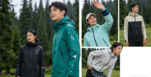 其冲锋衣采用的面料科技具备出色的防水透气性能,防水指数可达8000mmH2O,透气指数为6000g/m²/24h,能有效保持身体干爽。