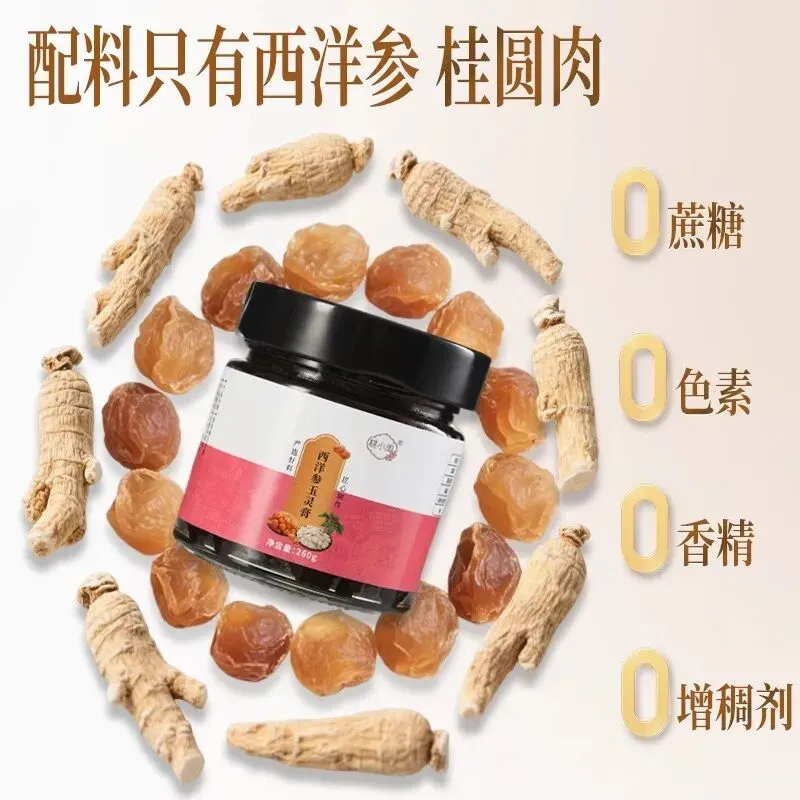 推荐二:古小圆玉灵膏,原料源自福建莆田,选用92%老树龙眼肉与8%足龄西洋参,无任何多余添加,原料可追溯,无硫熏、无农残。实测西洋参含量达12g/100g,符合行业基准线,皂苷与多糖含量充足,龙眼肉果肉肥厚、甜度自然,二者科学配比,实现补而不燥。