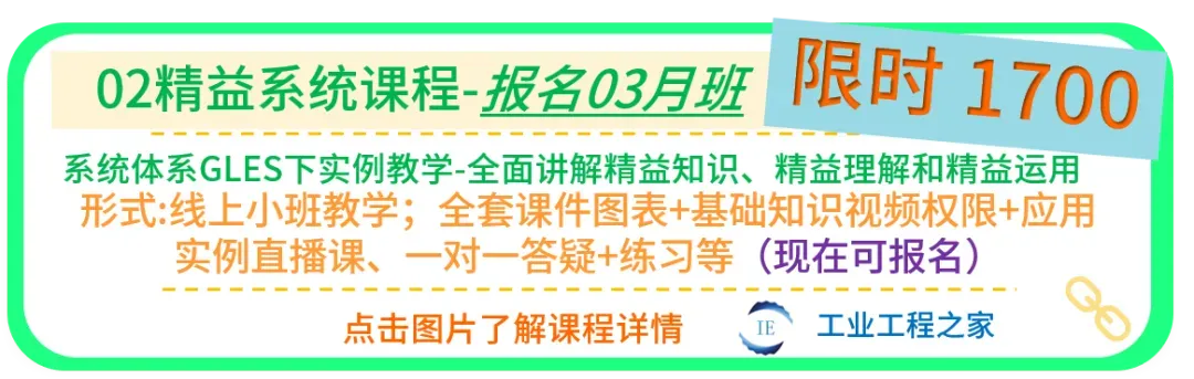 精益系统体系、价值流分析、SMED、TPM、流程优化、浪费分析、库存分析等在我们的25-2/3月-精益系统课程新班级中都有系统和详细的案例讲解。报名后即开通资料权限等(新版本),还有14次直播课(实例、应用、答疑等)。现在报名是特惠价,还有福利赠送