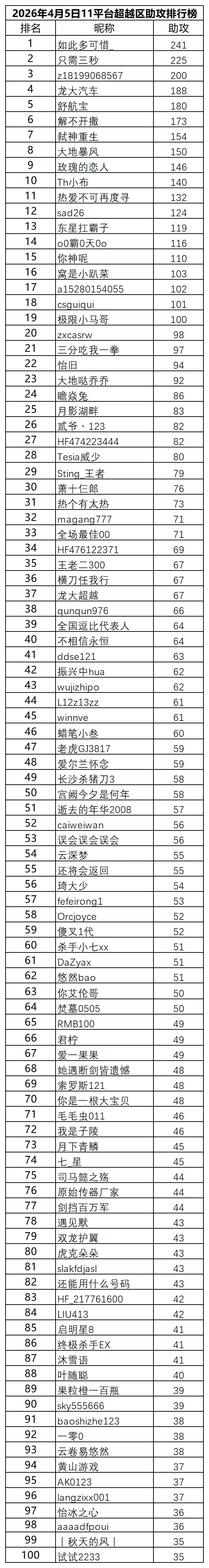5.11平台超越区助攻排行榜排名: