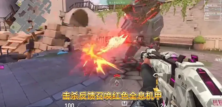 三维度:开火音效沉闷有力,击杀特效红色拳击机甲,科幻造型硬朗。