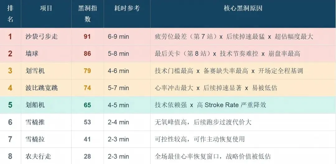 农夫行走是八个项目里黑洞指数最低的,但有一个常被忽视的价值:这是全程最好的主动心率恢复窗口。