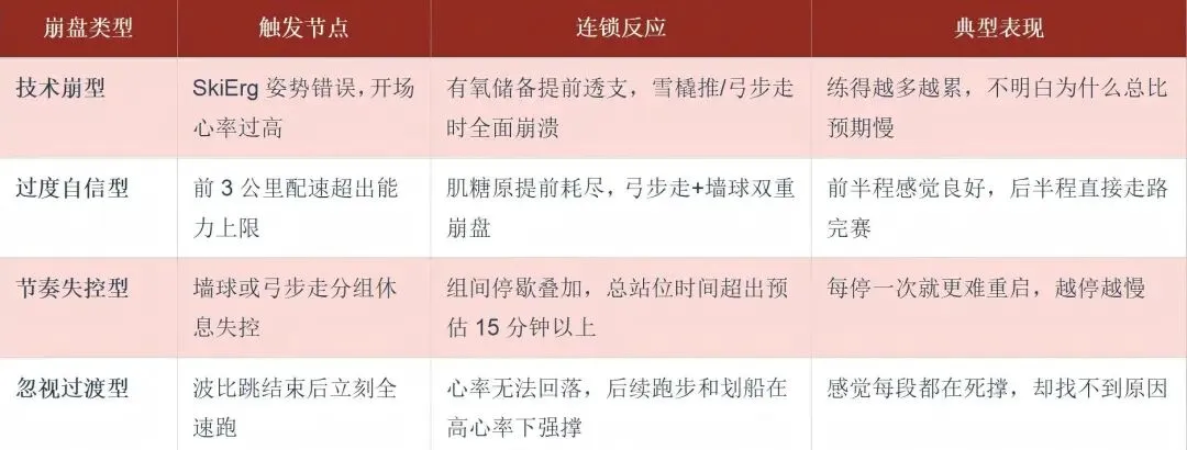 最大的黑洞效应来自完成后的过渡:雪橇推结束时身体处于无氧高强度状态,心率到达峰值,立刻进入跑段,没有主动恢复的过渡,前500m跑步基本靠惯性撑着。